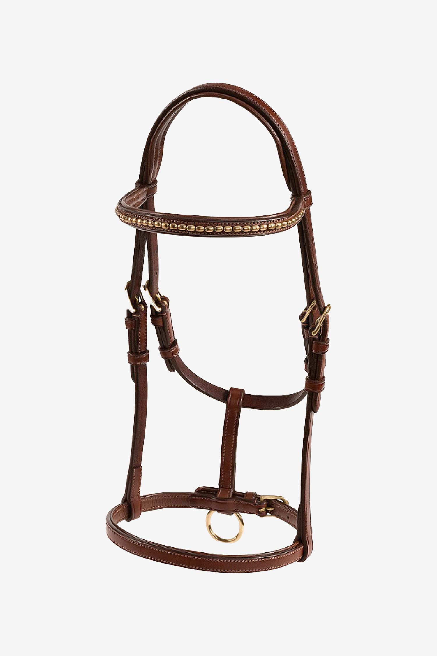 Eg bark med messingspænder og messingsnitter på pandebåndet.