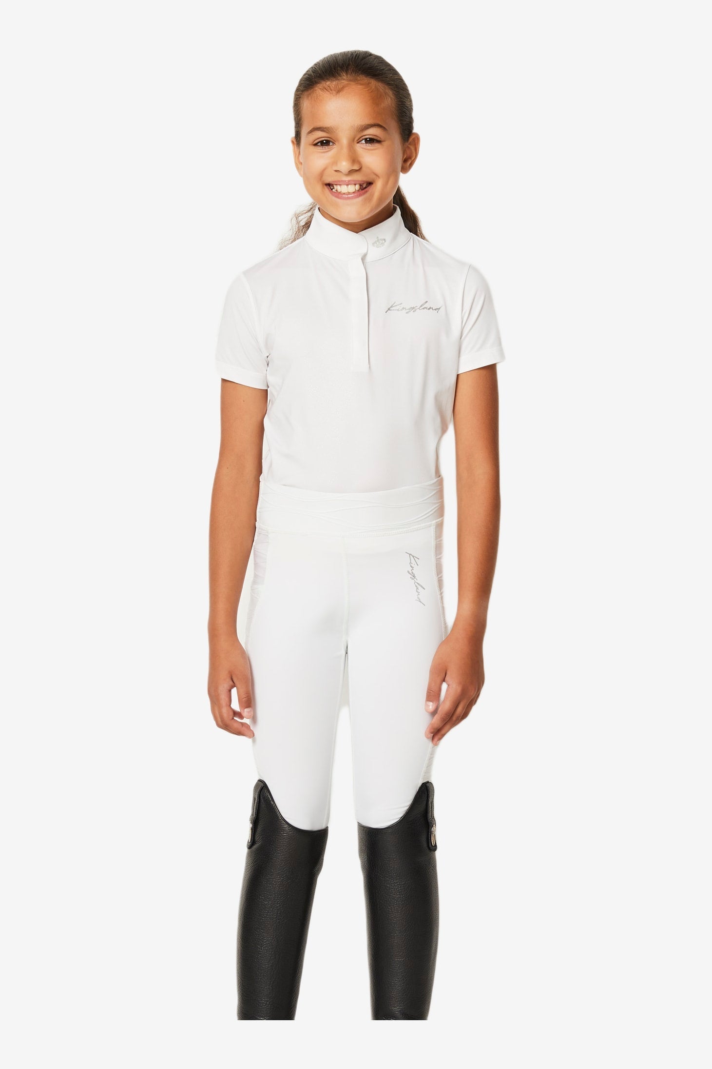 Konkurrenceskjorte fra Kingsland. Fin og dejlig kortærmet T-shirt fra Kingsland. KLpimrose er konkurrenceskjorten til piger, designet med minimalistisk design. Vævet krave og knapstolpe med indvendig trykknap. Lavet af et stof, der skinner flot i solen og har en høj åndbarhed og tørrer hurtigt. Leder også fugt væk fra kroppen. På brystet sidder Kingslands fine logo i sølvglitter.