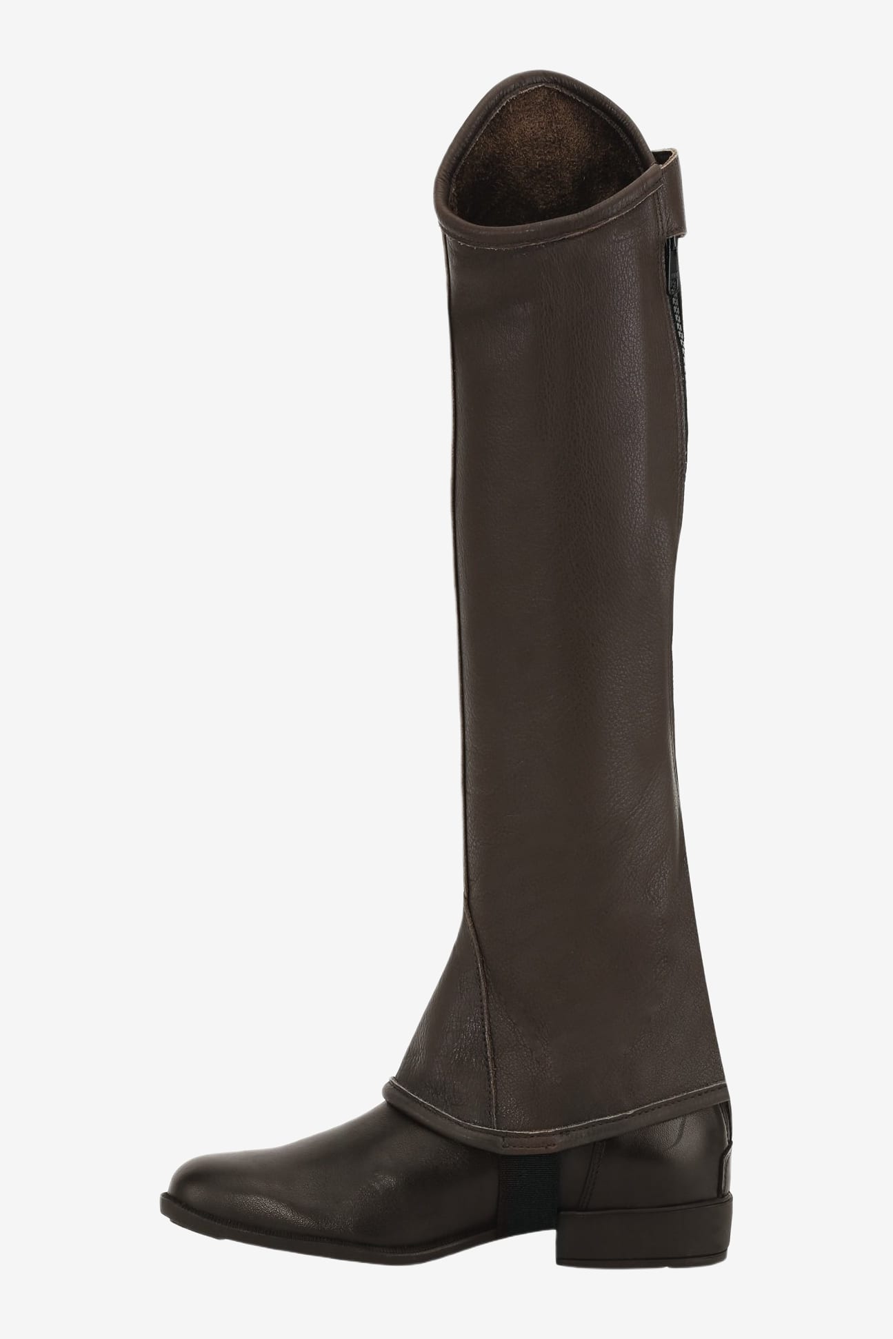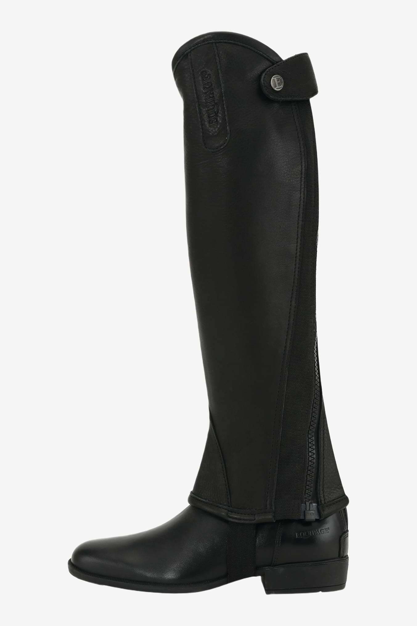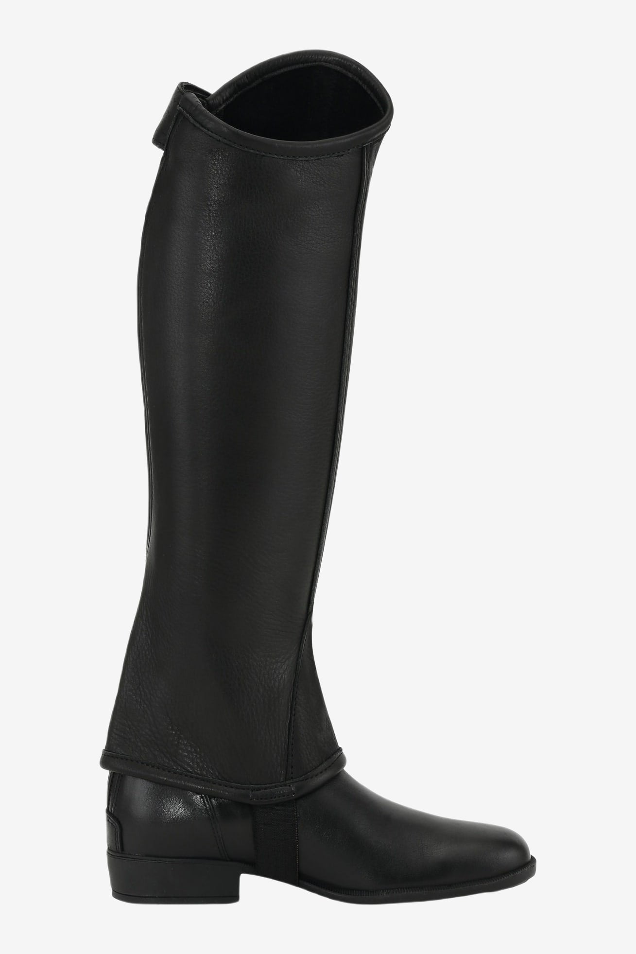 Shortchaps gjorda i mjukt anilineskinn för bra passform. Stark resår längs hela chapsen. Dragkedjan är svängd, går snett från utsidan upp bak till knäveck. Knäppe upptill med tryckknapp. Sitter väldigt snyggt på benen!