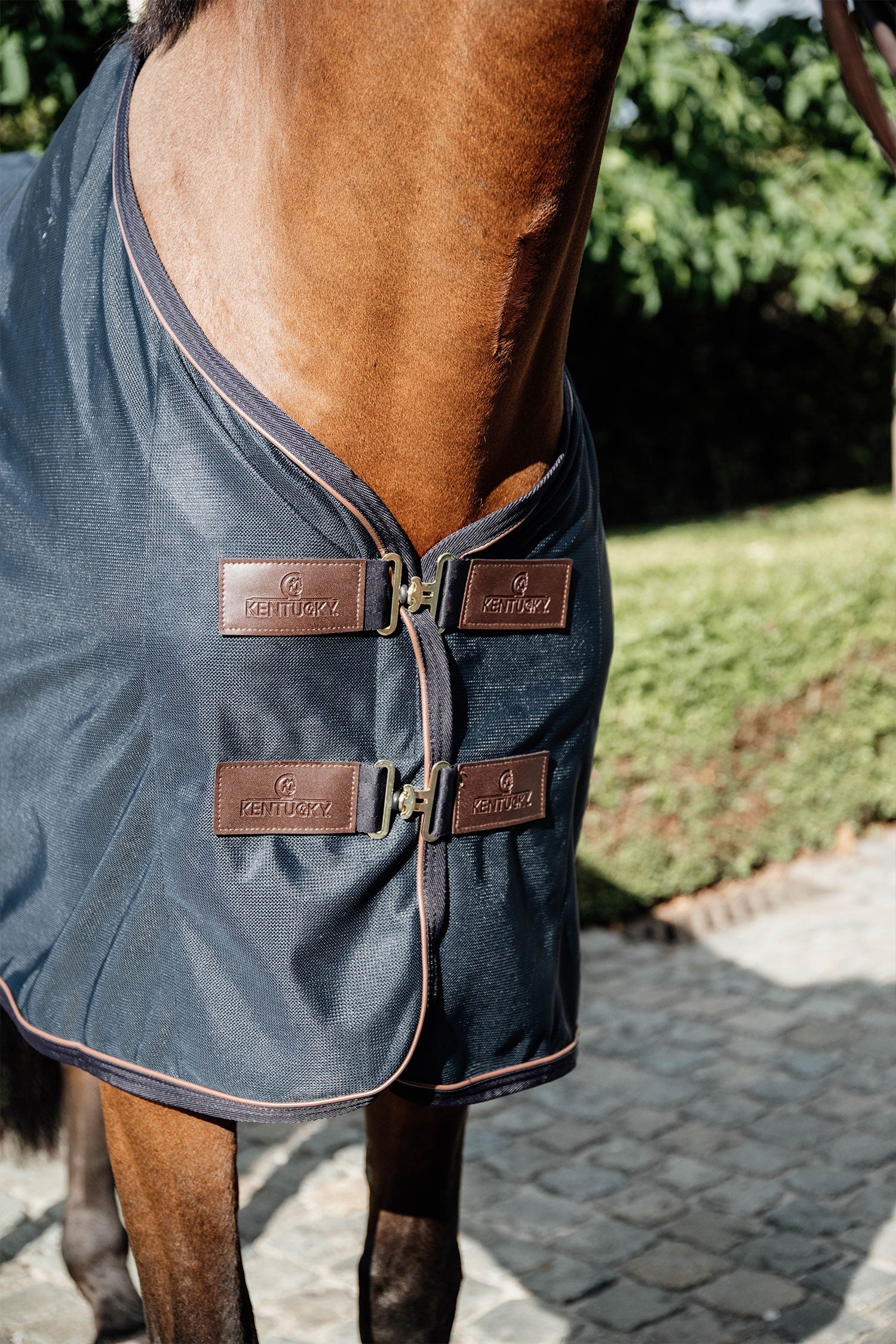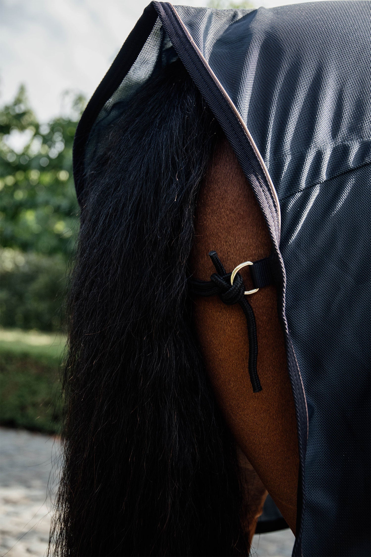 Perfekt für Pferde mit empfindlicher Haut, da diese Decke besonders leicht ist und Fliegen vom Pferd fernhält. Das Material ist sehr atmungsaktiv und äußerst robust. Für die beste Passform ist sie anatomisch geformt und verfügt über künstliches Lammfell am Widerrist.