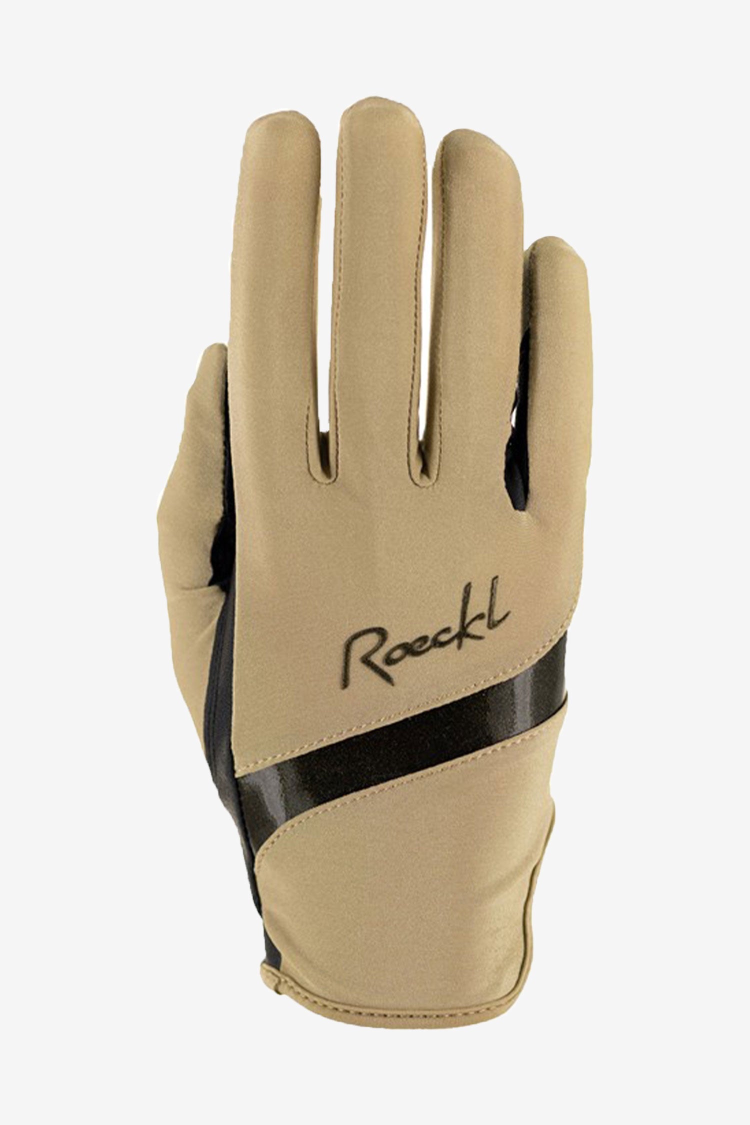 Reithandschuh von Roeckl aus Funktionsmaterial. Das Logo und die Details auf dem Handschuh schimmern schön in Schwarz/Glitzer. Die Innenseite besteht aus einem weichen und dünnen PU-Material, das einen guten Griff bietet und gleichzeitig das Gefühl für den Kontakt zum Pferdemaul erhält.