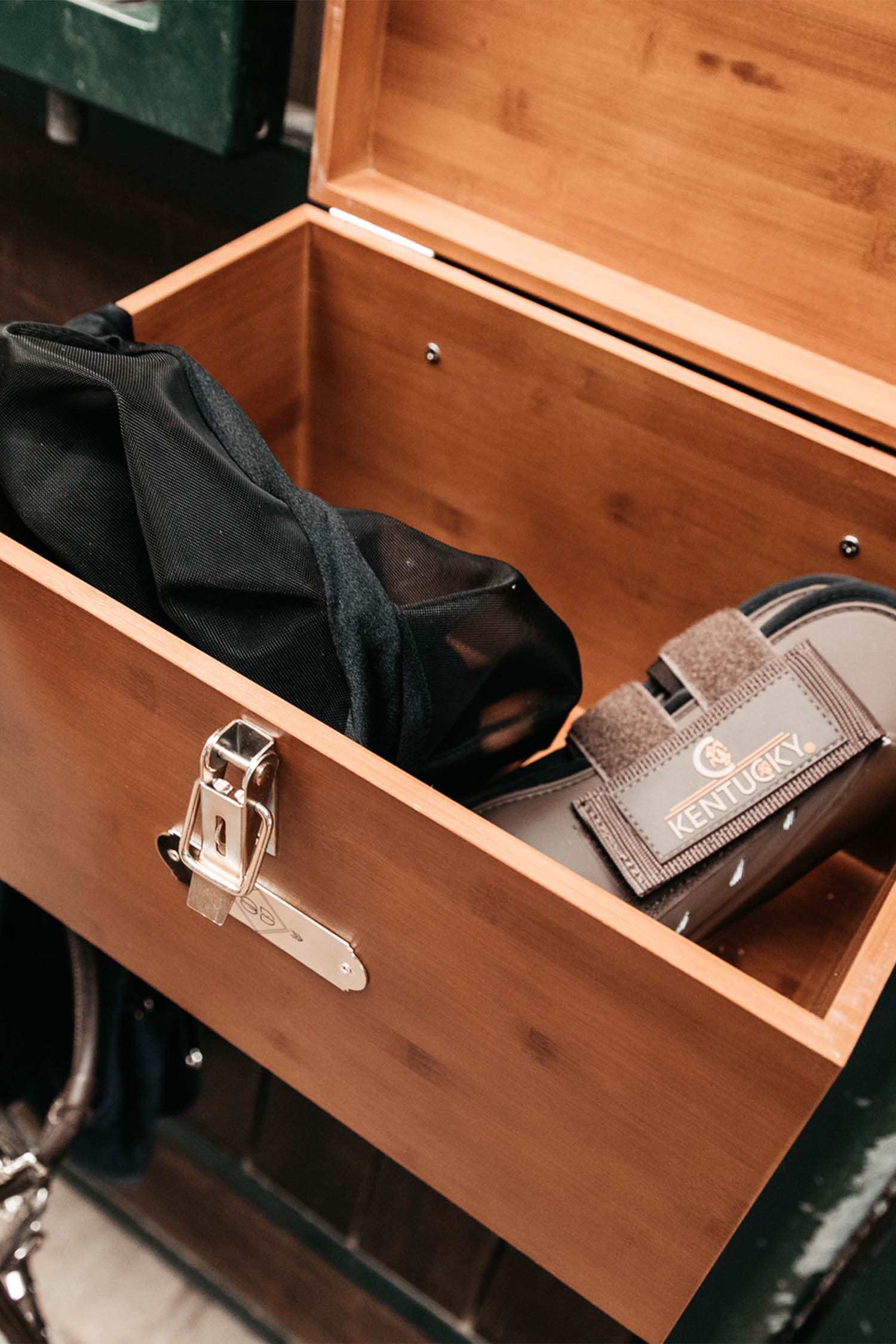 Der obere Teil lässt sich mit zwei goldenen Beschlägen öffnen und schließen, an denen du auch ein Vorhängeschloss anbringen kannst.