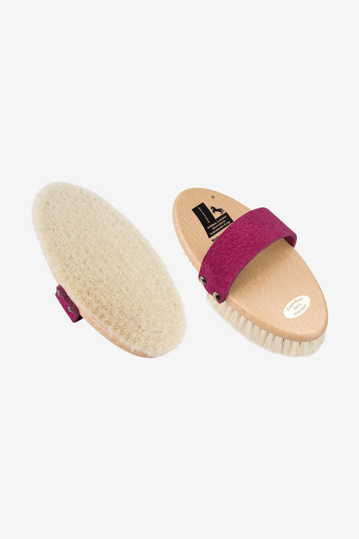 Hergestellt ausschließlich aus Ziegenhaar höchster Qualität mit einer extra-weichen Härte. Ziegenhaar eignet sich hervorragend für ein perfektes Finish und verleiht dem Fell einen wunderschönen Glanz. Das weiche Ziegenhaar hinterlässt keinen Staub auf dem Pferdefell und ist in seiner Glanzwirkung überlegen. Es sorgt zudem für ein sehr gemütliches und kuscheliges Gefühl. Komplett aus natürlichen Materialien gefertigt, die keine elektrostatische Aufladung erzeugen. Die Länge des Ziegenhaars beträgt 2,7 cm. Die Bürste besteht aus lackiertem Buchenholz und ist zusätzlich antibakteriell behandelt. Sie liegt sehr gut in der Hand und bietet ein angenehmes Gefühl beim Halten. Der Riemen über dem Handrücken besteht aus hochwertigem Leder, das angenehm auf der Haut liegt und bei Bedarf in der Länge gekürzt werden kann.