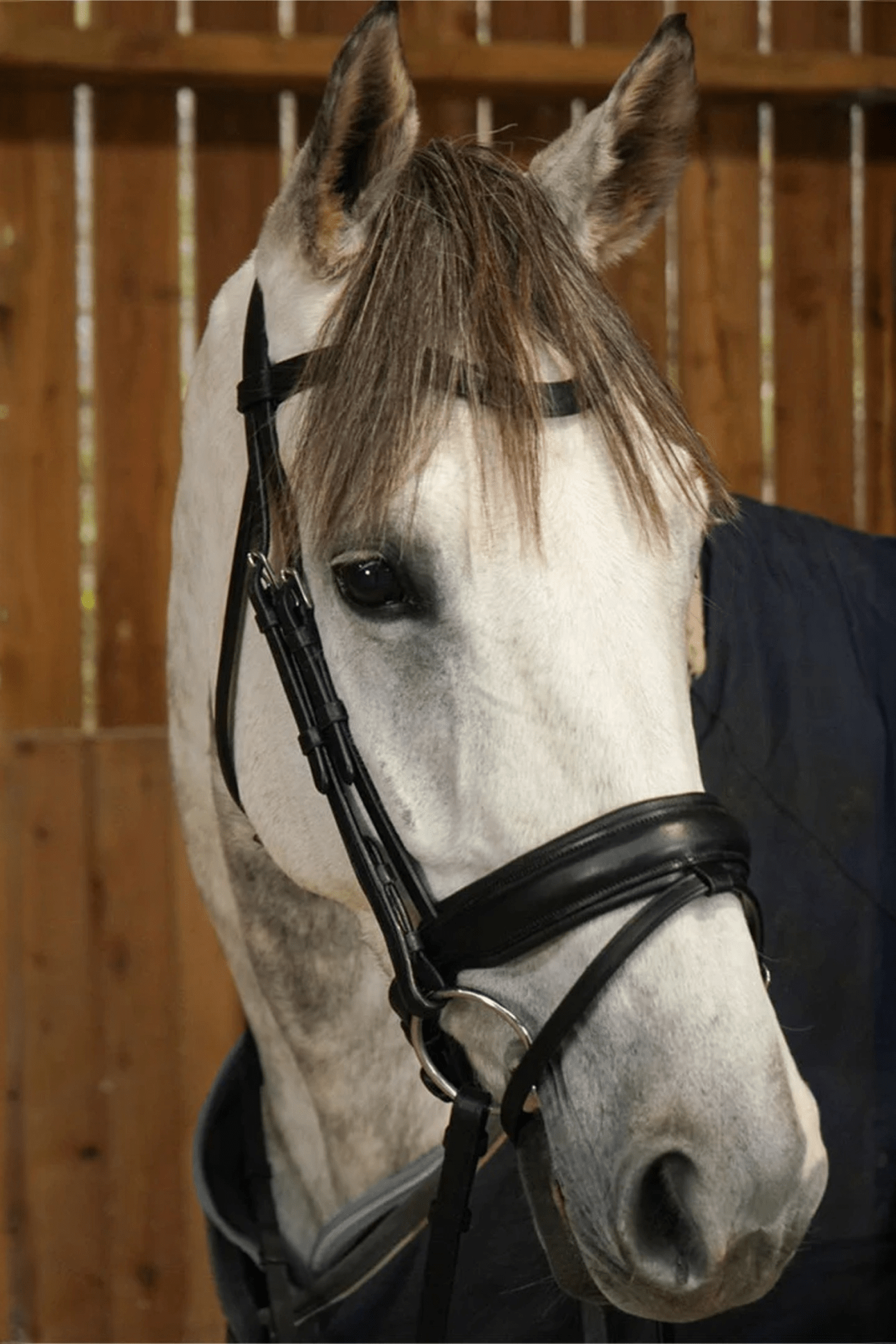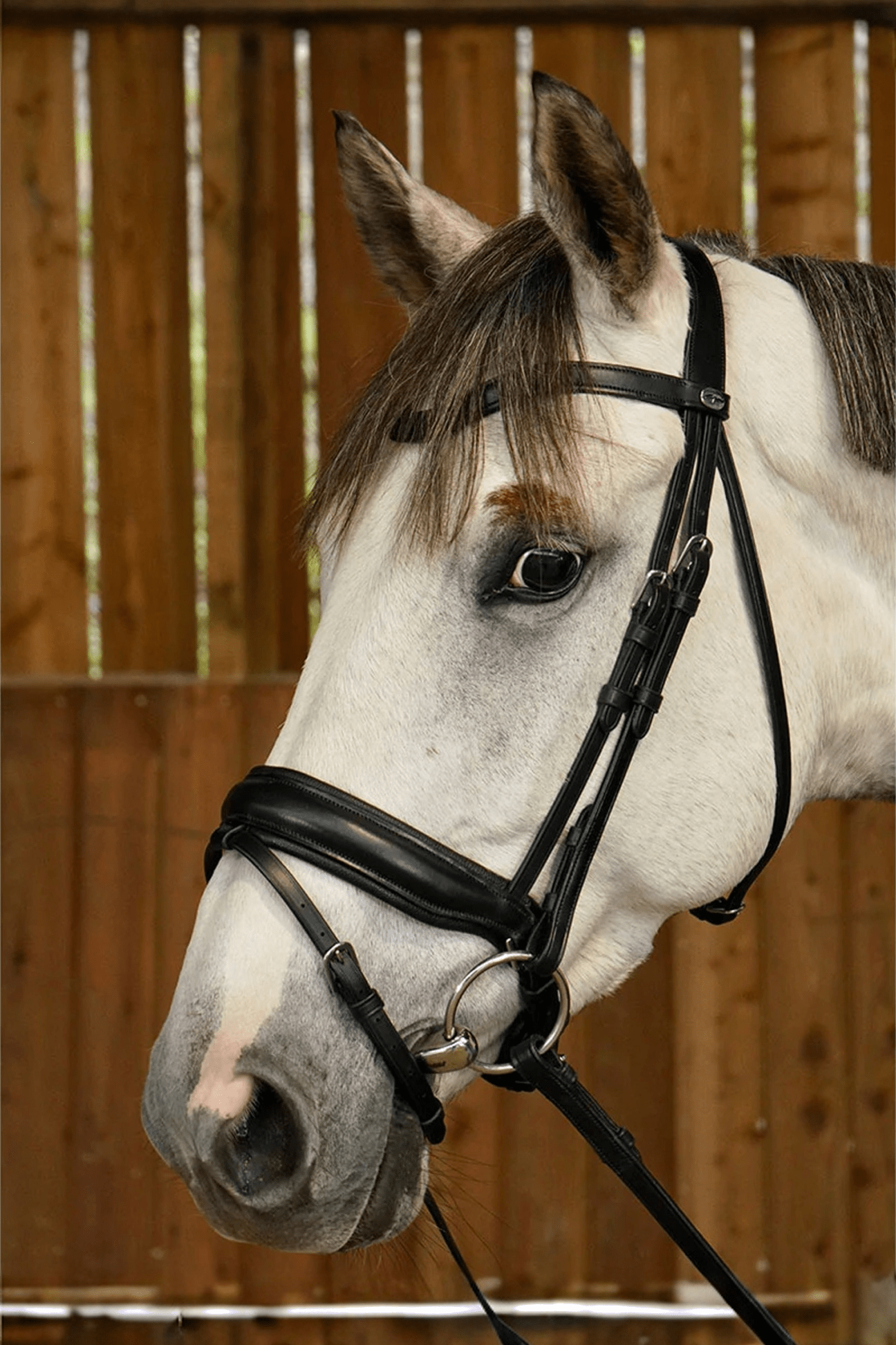 Dressyrträns med kombinerad nosgrimma, Working Collection från Dyón. Elegant dressyrträns med smidig anatomisk nosgrimma tillverkat i buffaloläder. Vackert böjt pannband med Dyón logga. Pullbacknosgrimma i smidigt läder med mjuk läderplatta under spännet för att skydda din häst mot skav och extra komfort. Silver spännen i rostfritt stål, matchande färg på sömmarna.