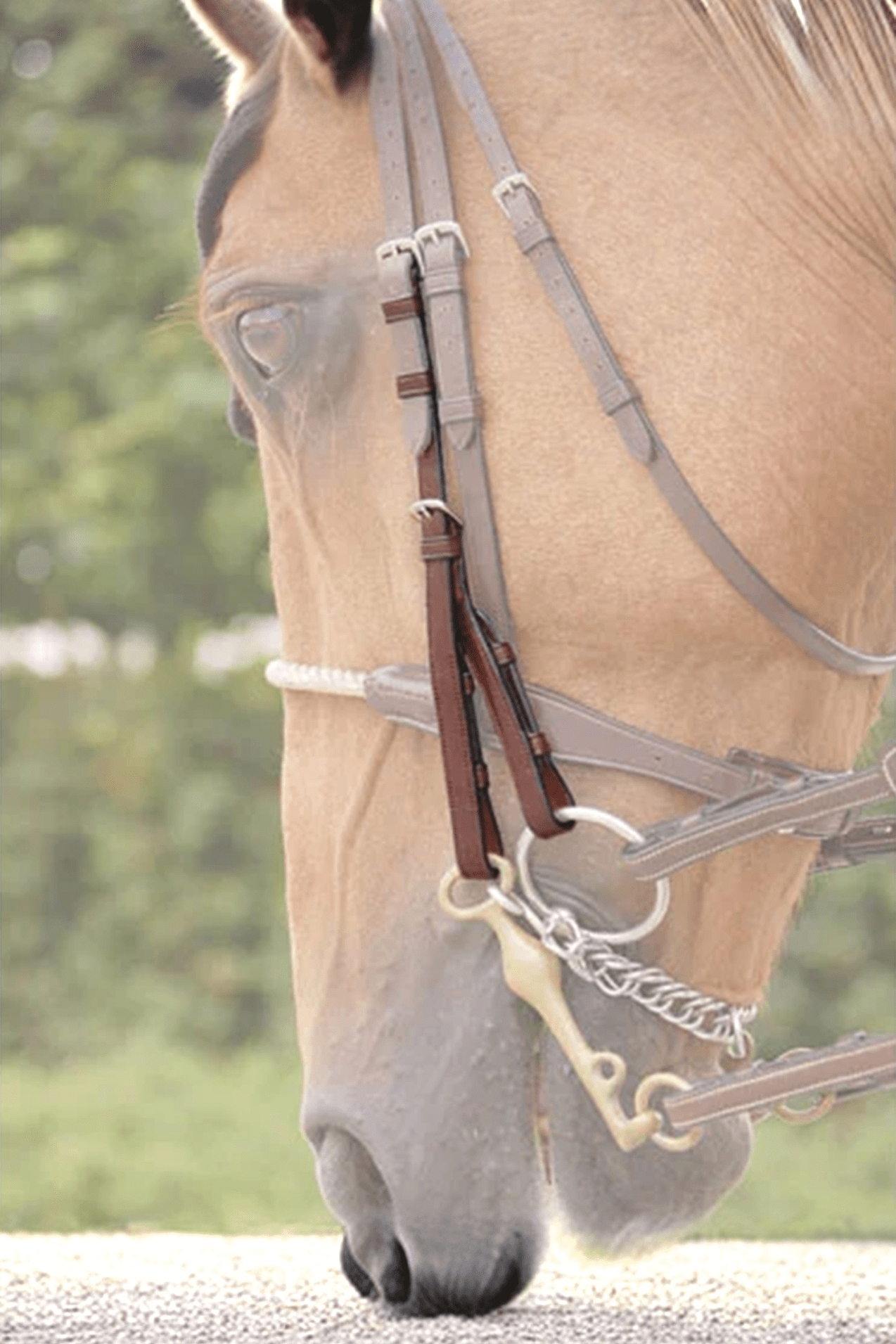 Dubbel sidostycke från Dyón, New English Collection. Sidostycke med dubbla spännen i spanskt läder med silverspännen. Förvandlar enkelt ditt vanliga träns till ett kandar.