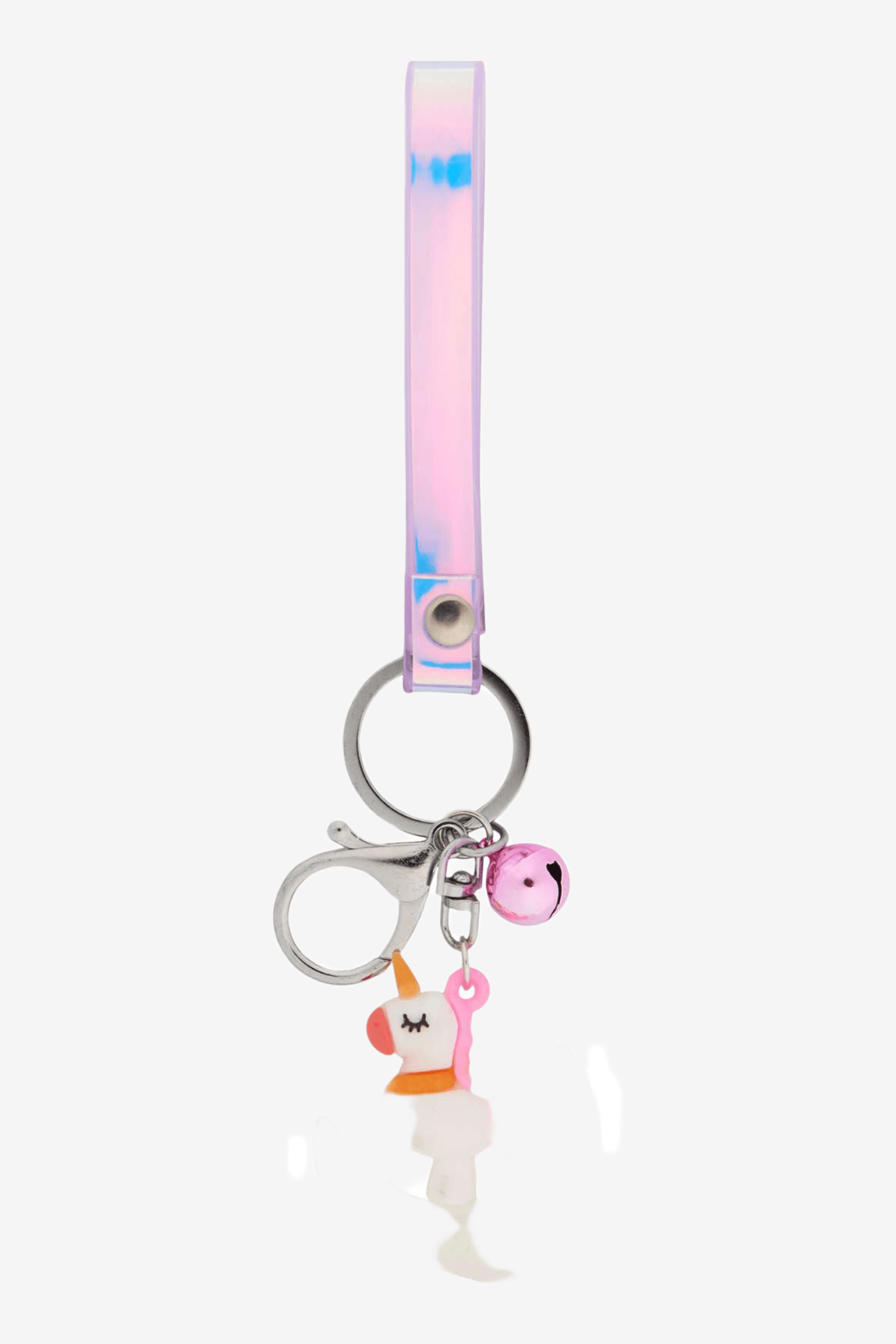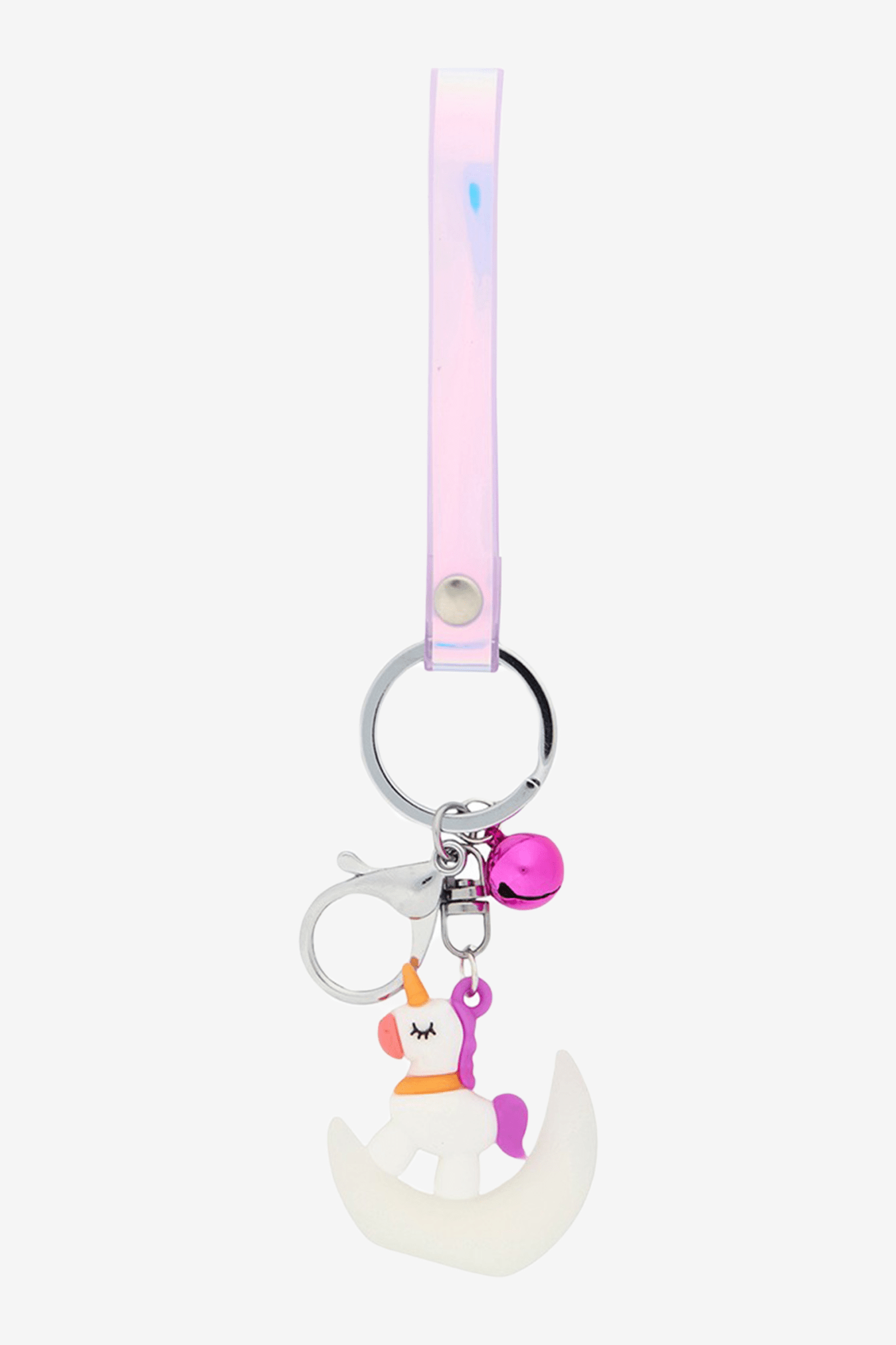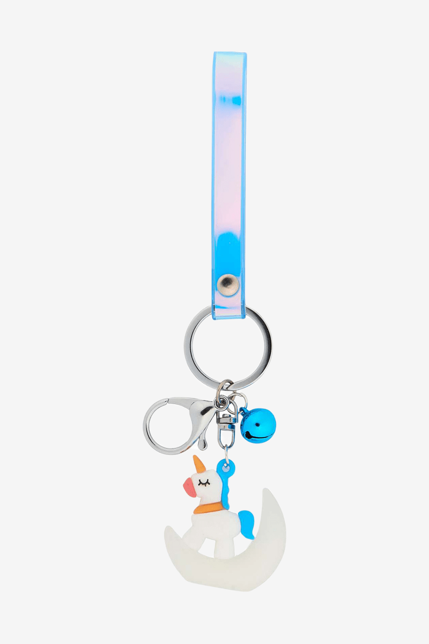 Niedliches Einhorn und Mond zusammen mit einem reflektierenden Regenbogen an einem Schlüsselanhänger. Auch als Armband verwendbar. Der Mond leuchtet im Dunkeln.