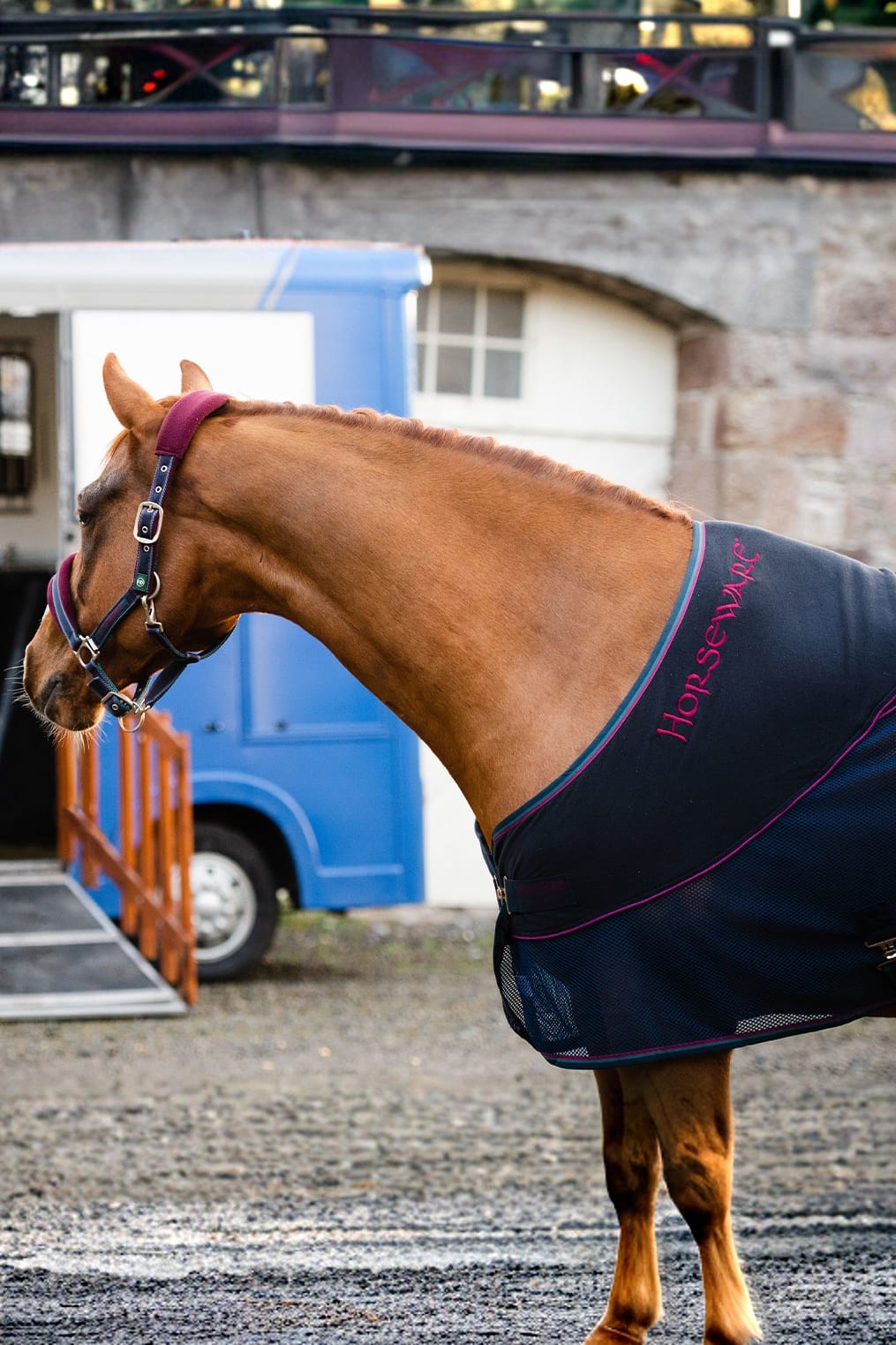 Perfekt für den Einsatz im Stall, beim Transport des Pferdes oder auf Turnieren. Verschluss mit doppeltem Frontverschluss, Kreuzgurten unter dem Bauch und Schweifriemen.