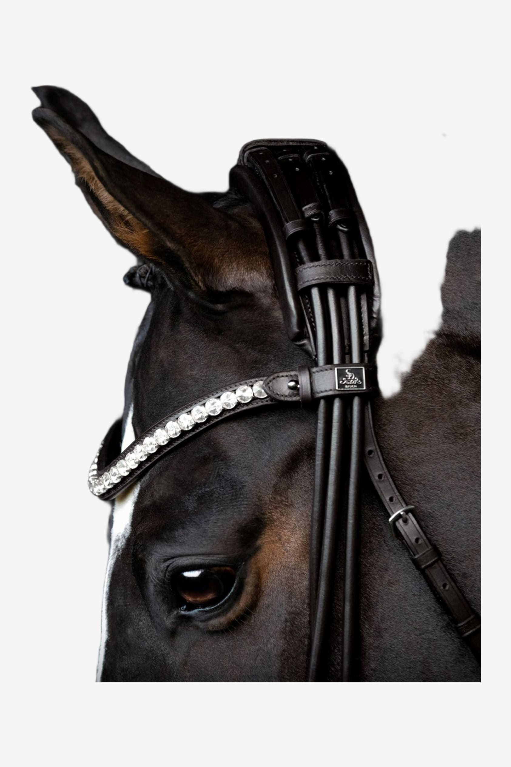 Belissimo II rundgenähte Kandare, handgefertigt aus umweltfreundlichem Büffelleder höchster Qualität, sodass Sie eine Trense erhalten, die Sie viele, viele Jahre verwenden können. Das Genickstück dieser rundgenähten Kandare ist ein komplett neues Design, bei dem SD Design noch weiter gegangen ist, um Druck auf das Pferd zu vermeiden. Das Genickstück hat eine große Auflagefläche, die den Druck minimiert, und ist doppelt gepolstert. Das Reithalfter ist in der Mitte breit und an den Enden schmal, sodass es nicht auf die Nerven drückt und viel Platz für das Gebiss bleibt.