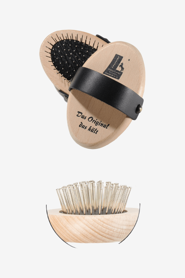 Eine Schweif- und Mähnenbürste aus hochwertigem Buchenholz mit Wachsbehandlung und einem Gummipad mit sanften Metallstiften. Ein praktischer Ledergriff an der Oberseite hält die Bürste beim Entwirren und Pflegen von Mähne und Schweif Ihres Pferdes sicher in der Hand.