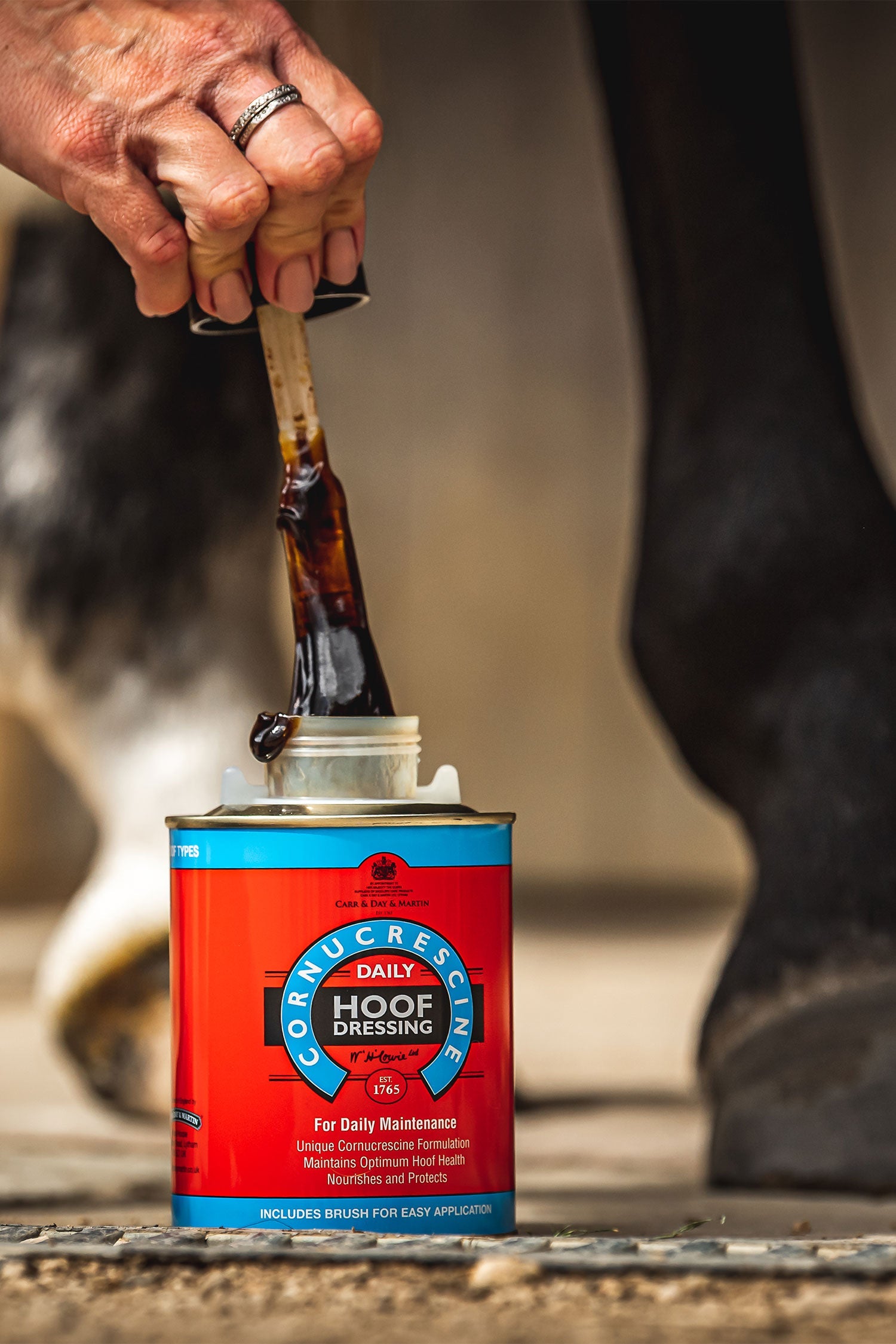 - Cornucrescine Daily Hoof Dressing is the absolute best you can use every day on the horse's hooves. Use the included brush in the lid for easy application.