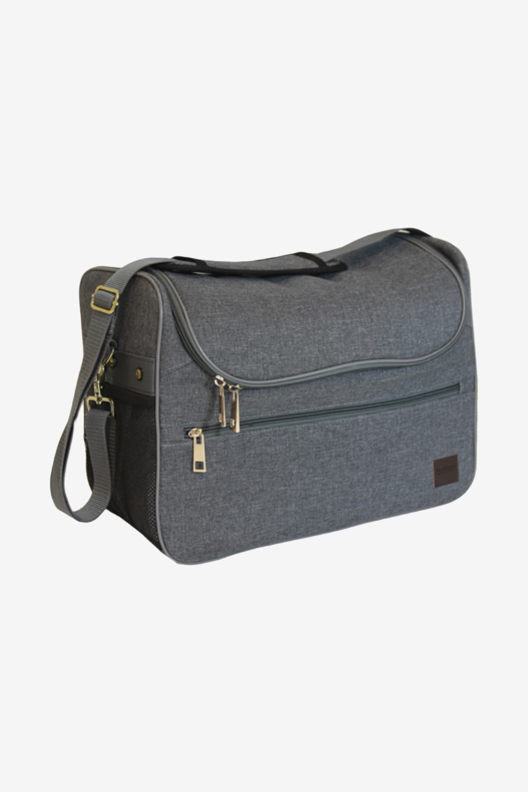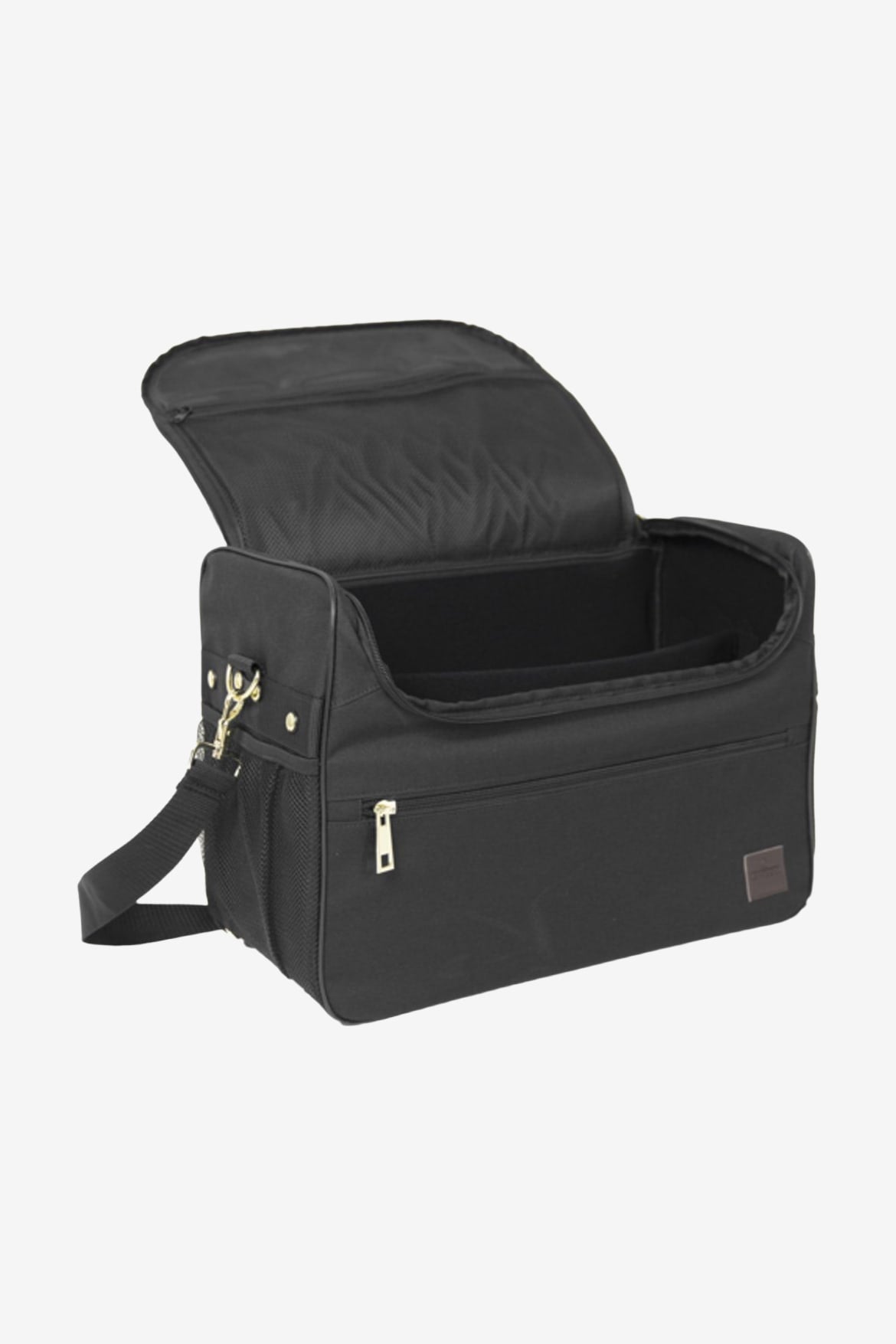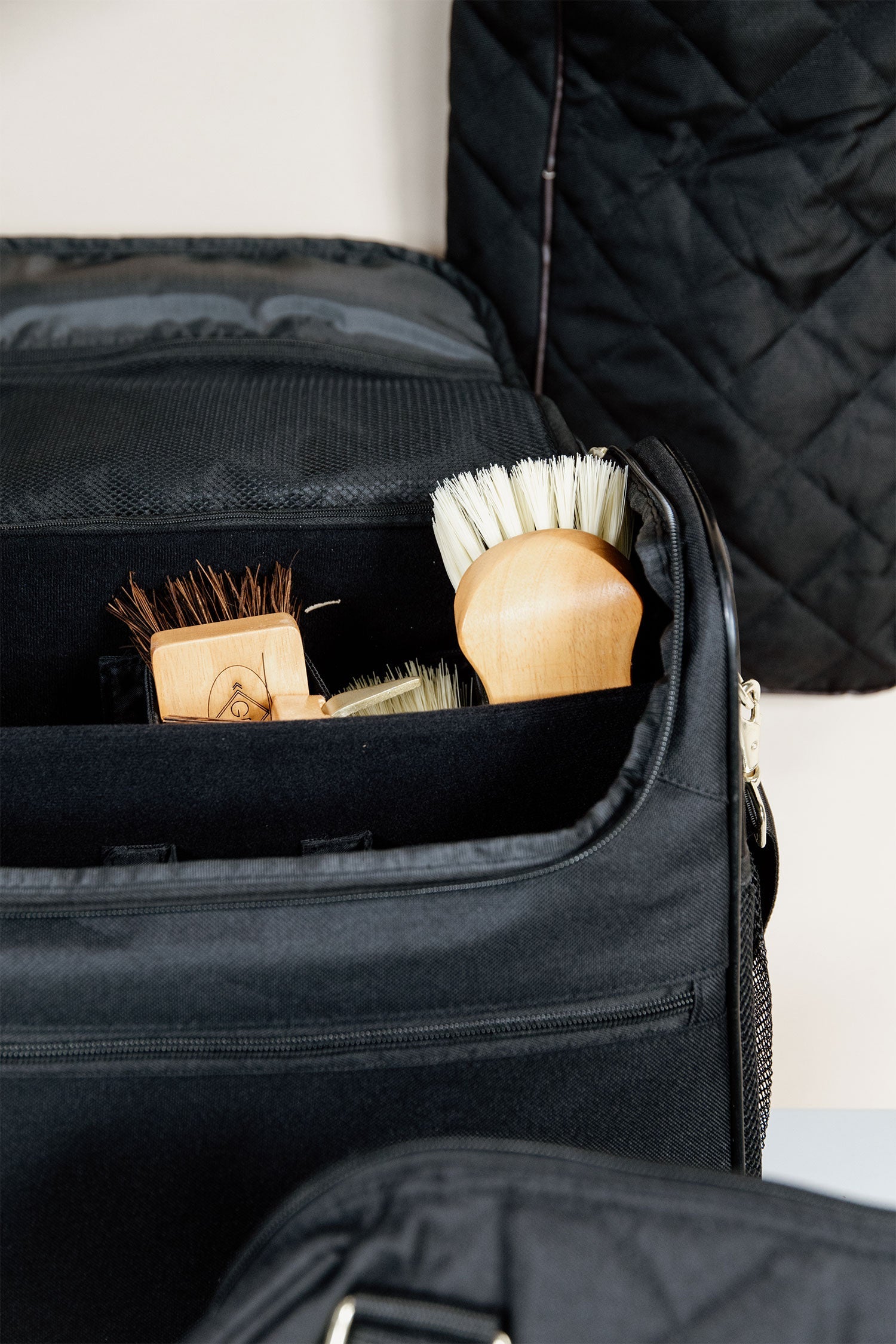 The size of the bag also allows spray bottles to easily fit inside. The bag is equipped with several pockets. Two mesh pockets on the sides of the bag. A smaller inner pocket for small accessories. On the front, there is a larger pocket with a brass-colored zipper.