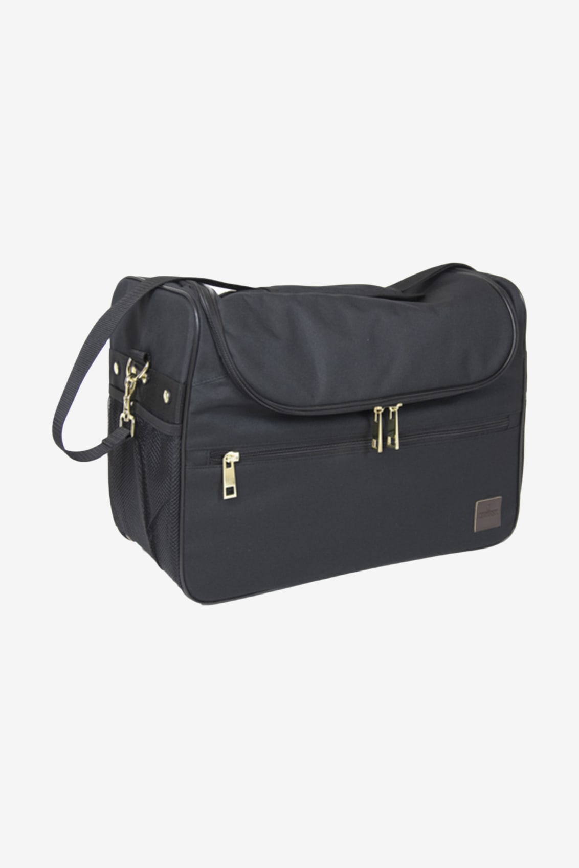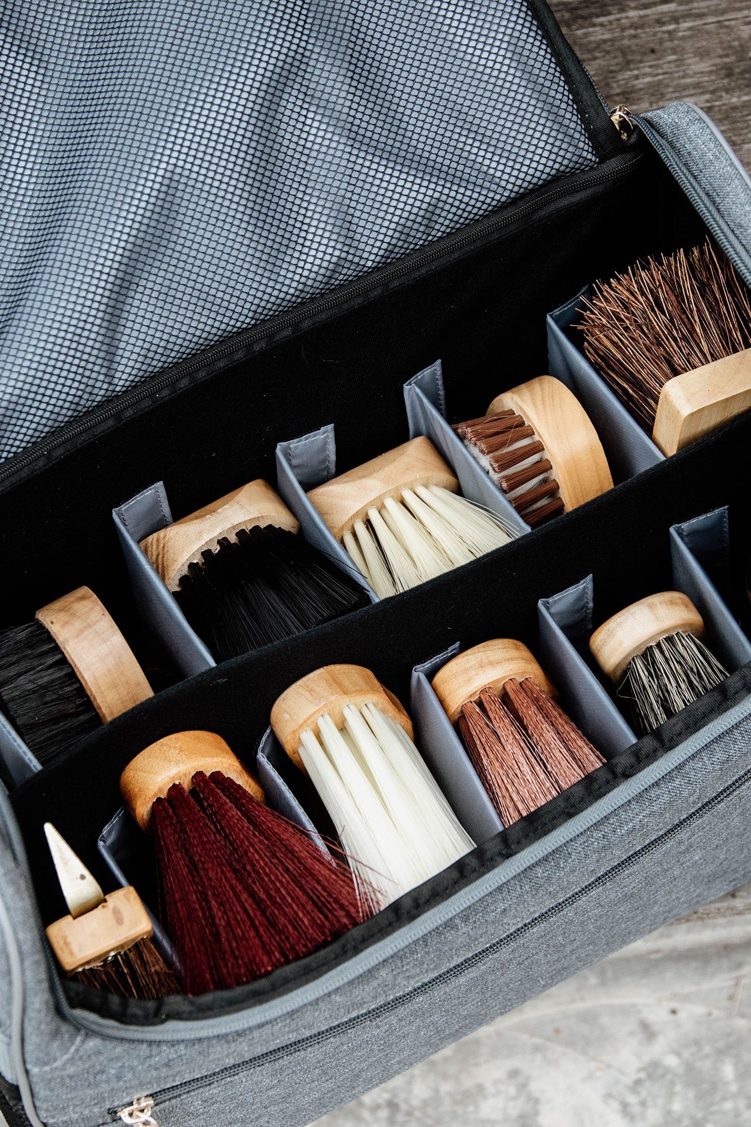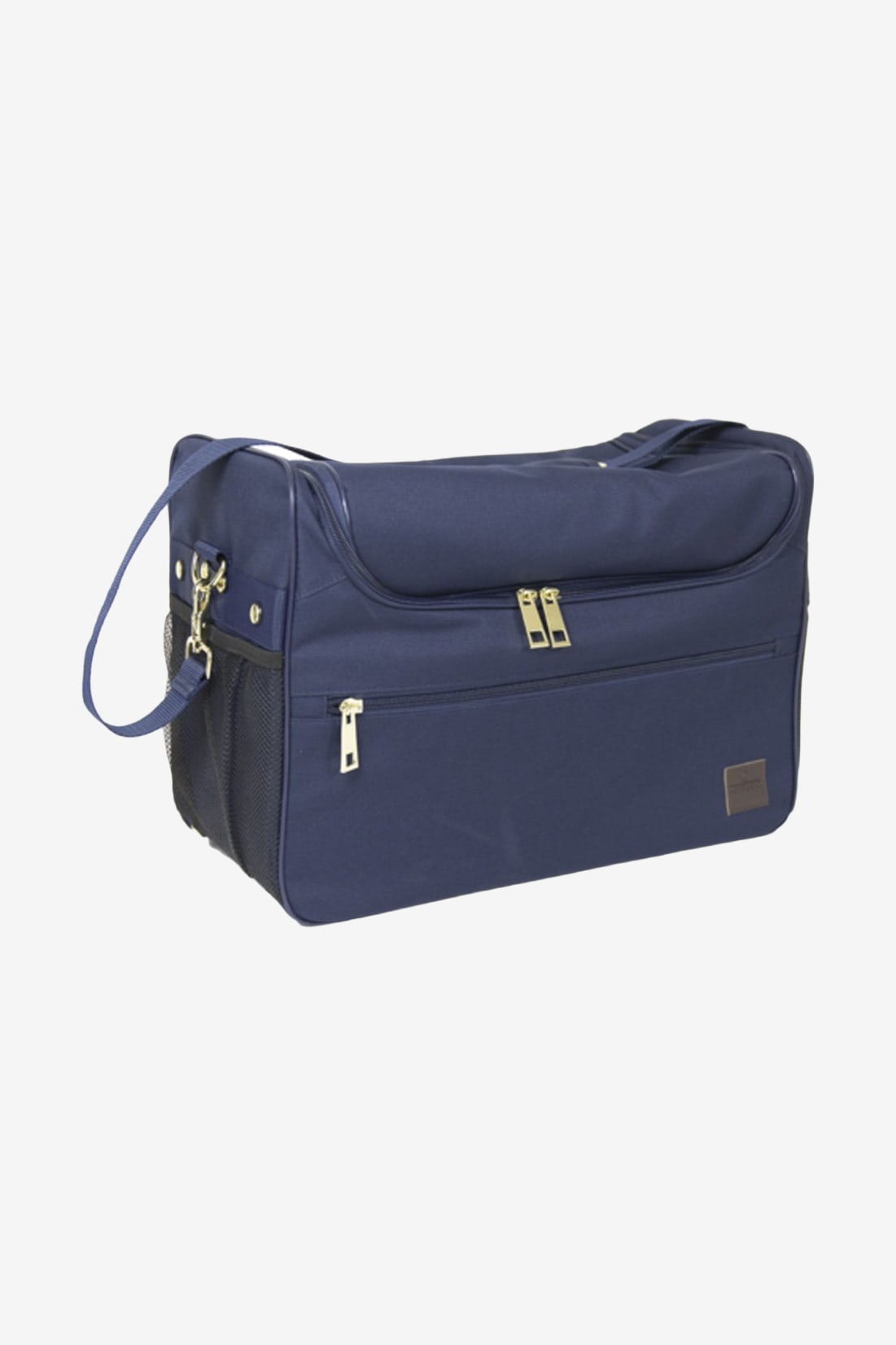 The size of the bag also allows spray bottles to easily fit inside. The bag is equipped with several pockets. Two mesh pockets on the sides of the bag. A smaller inner pocket for small accessories. On the front, there is a larger pocket with a brass-colored zipper.