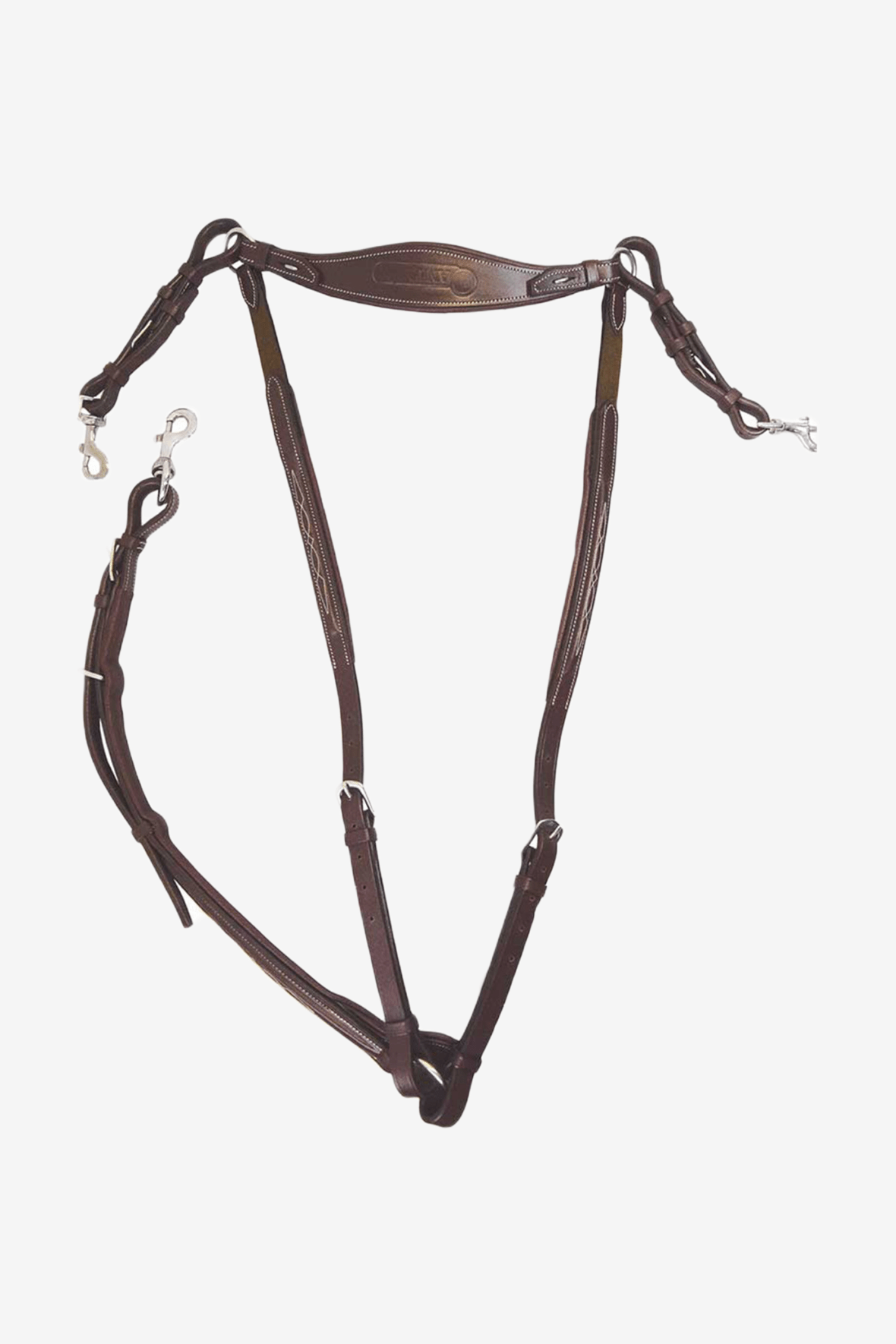 En klassisk förbygel i högkvalitativt läder från serien Signature by Antarés. Smarta spännen i rostfritt stål att fästa i sadelns D-ringar och en avtagbar brygga över manken för ökad stabilitet. Lädret längs hästens bog har en snygg brodyr och brunt resår för ökad följsamhet. Fäste för martingaldel framtill. OBS säljs utan martingaldel, denna köps till separat.