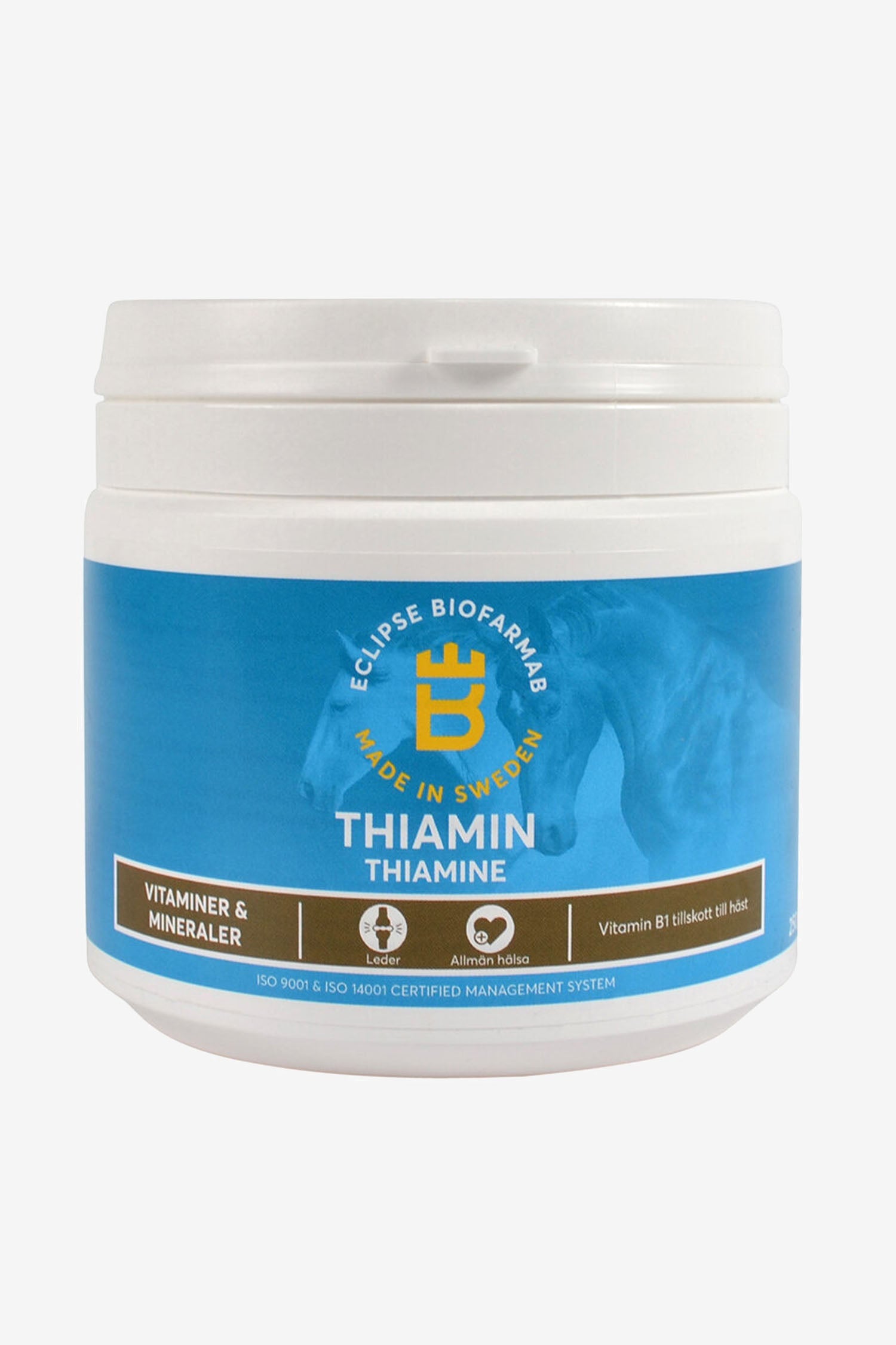 Thiamine or vitamin B1 is a coenzyme; a type of activator needed for the metabolism of, among other things, carbohydrates. It is also important for certain muscle and nerve functions as well as for the body's energy production. Thiamine is also an important substance for the body's handling of stress. Thiamine is often recommended in the treatment of patellar locking, according to veterinary prescription. Supplementation of vitamin B1 is often needed for high-performing horses or horses that change feed. The risks of overdose are considered small, as the vitamin is water-soluble and any excess is excreted through urine.