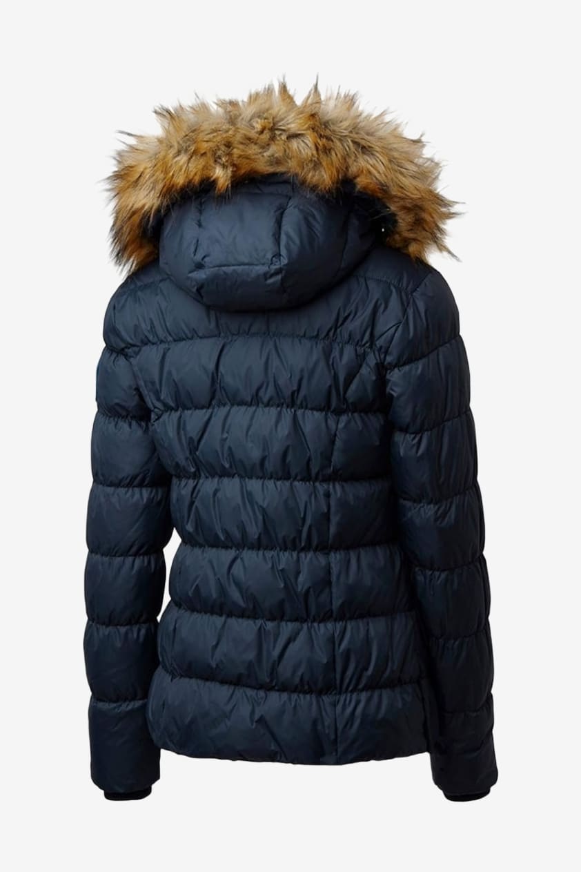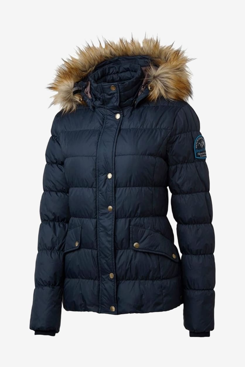 Elegant, lätt och varm dunjacka med en vattenavvisande finish. Avtagbar och justerbar luva med fuskpälskrage. 4 lager duntät konstruktion som förhindrar dunläckage. Ribbade muddar på insidan av ärmsluten för att hålla den kalla vinden ute. Fyra rymliga och varma fickor framtill på kappan med dragkedjor. Tvåvägsdragkedja framtill med sadelskydd för att förhindra skav mot sadeln. Knappar i sidorna för att öppna upp jackan vid ridning.
