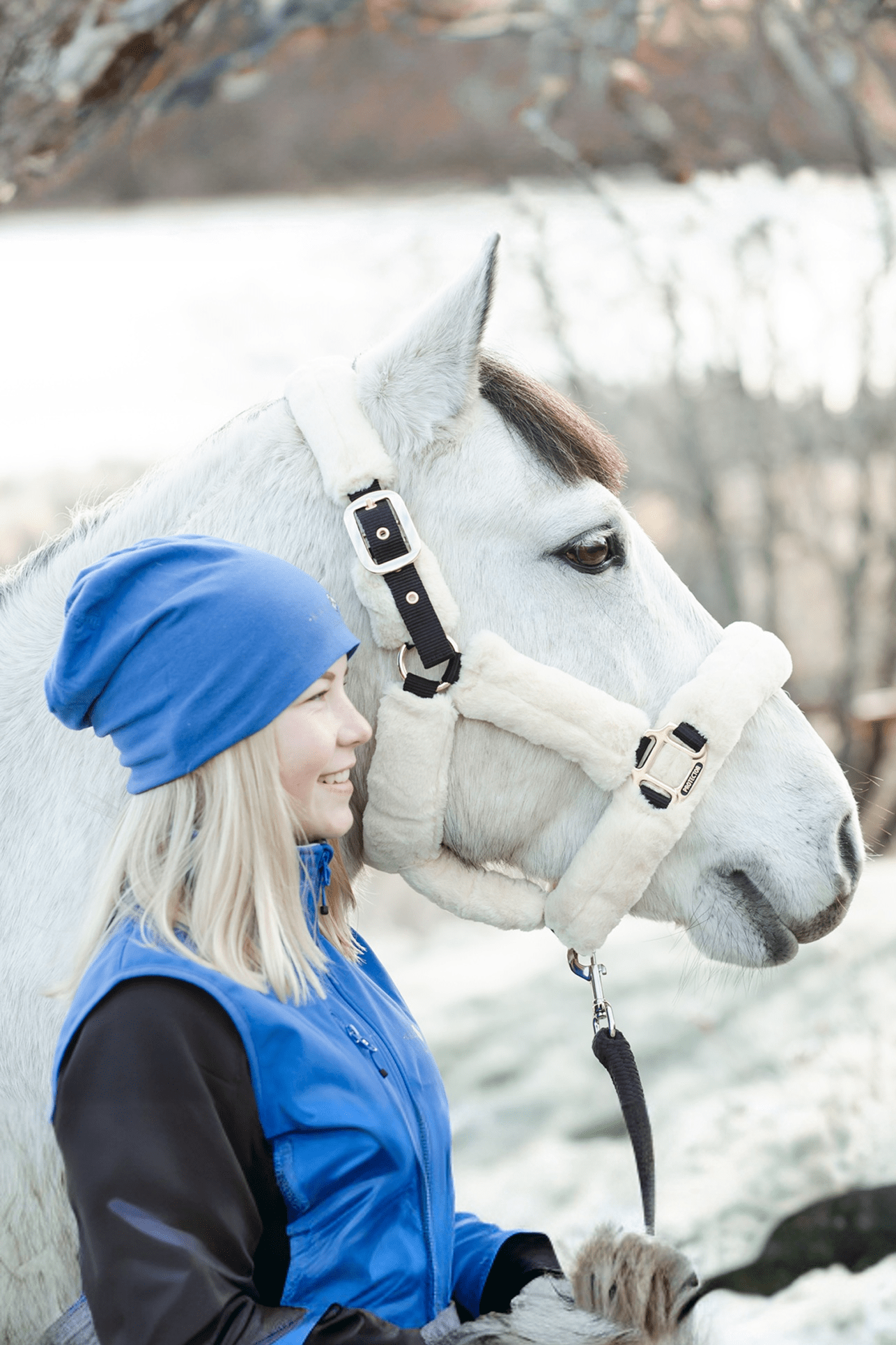 Kraftig grimma i polypropylene med mjuk syntetpäls från Protector. Nackremmen är ställbar på båda sidor. Söljor i gulmetall.