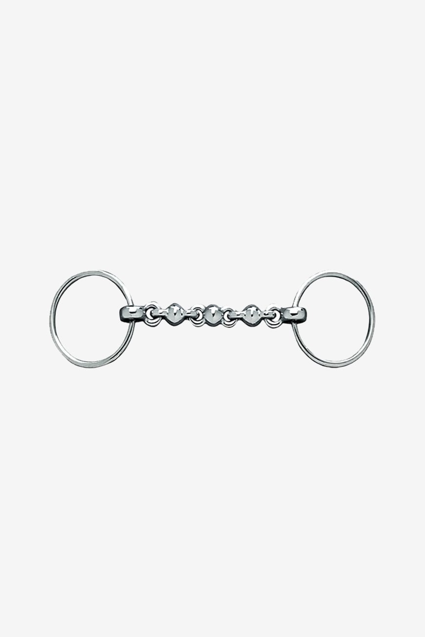 Acier inoxydable avec trois boules. Aide le cheval à ne pas attraper le mors et à ne pas devenir fort. L'ensemble du mors est articulé et ne se coince donc pas, encourageant le cheval à ne pas s'appuyer sur le mors.