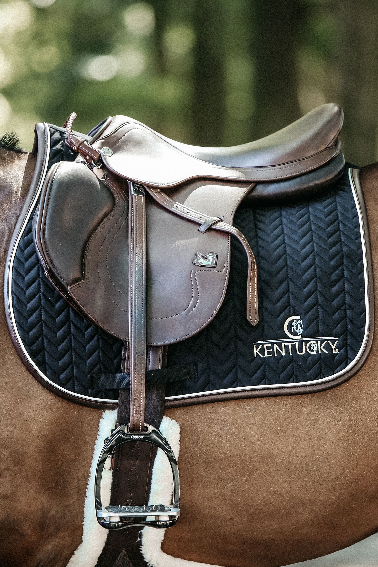 Superbe tapis de saut de Kentucky. Le tapis présente un joli motif chevron et est conçu pour le saut d'obstacles. Il offre un bon amorti entre le dos du cheval et la selle tout en protégeant contre les frottements.