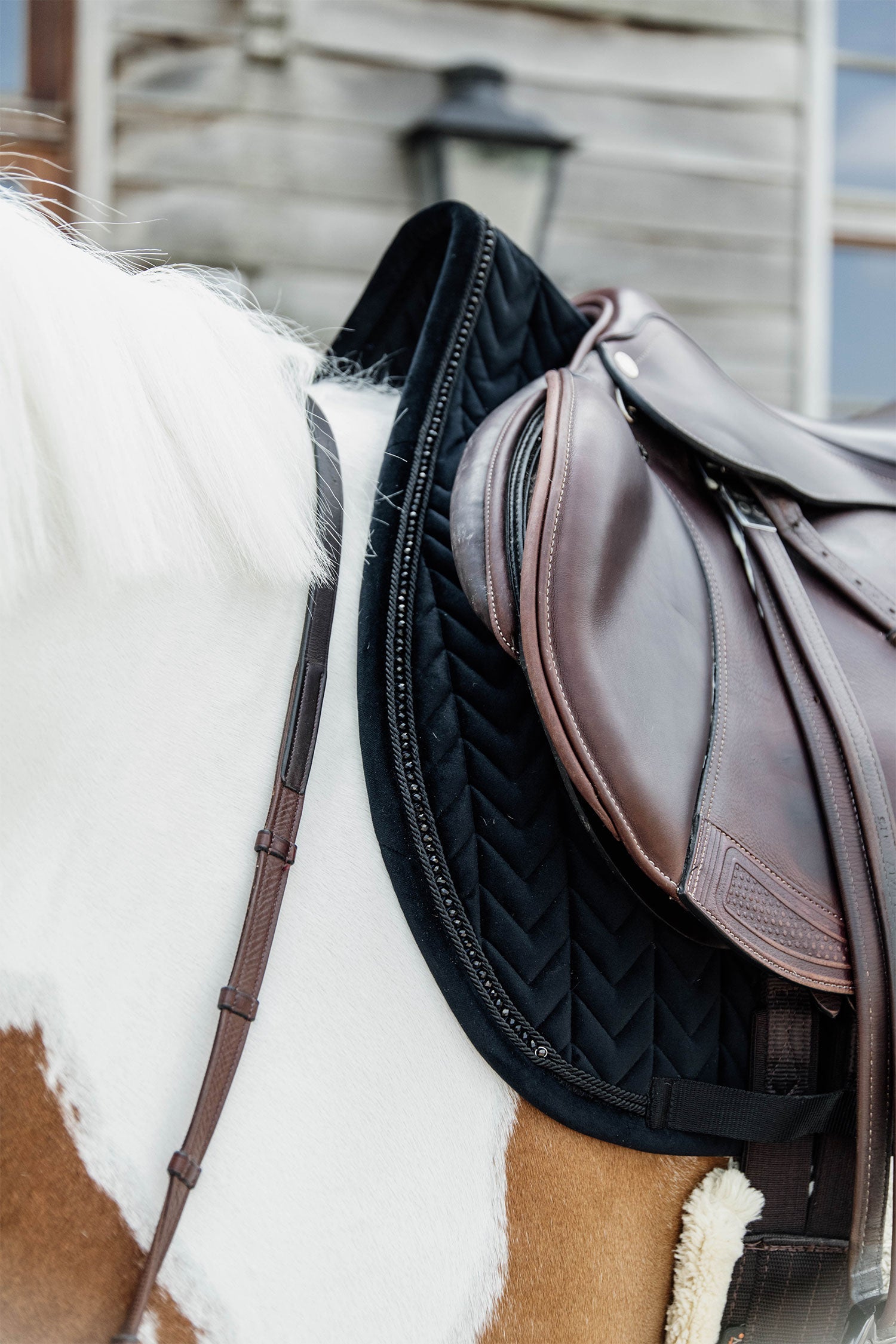 Saddle Pad Velvet Pearls från Kentucky Horsewear är följsamt formad efter hästens kropp och ger utmärkt dämpning mellan hästens rygg och sadeln samtidigt som ryggen skyddas mot friktion.