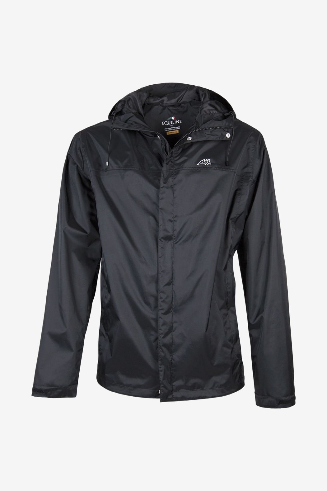 Une veste de pluie/coupe-vent sportive en noir classique de chez Equiline. La veste est légère, ce qui la rend parfaite pour l'écurie et l'équitation.