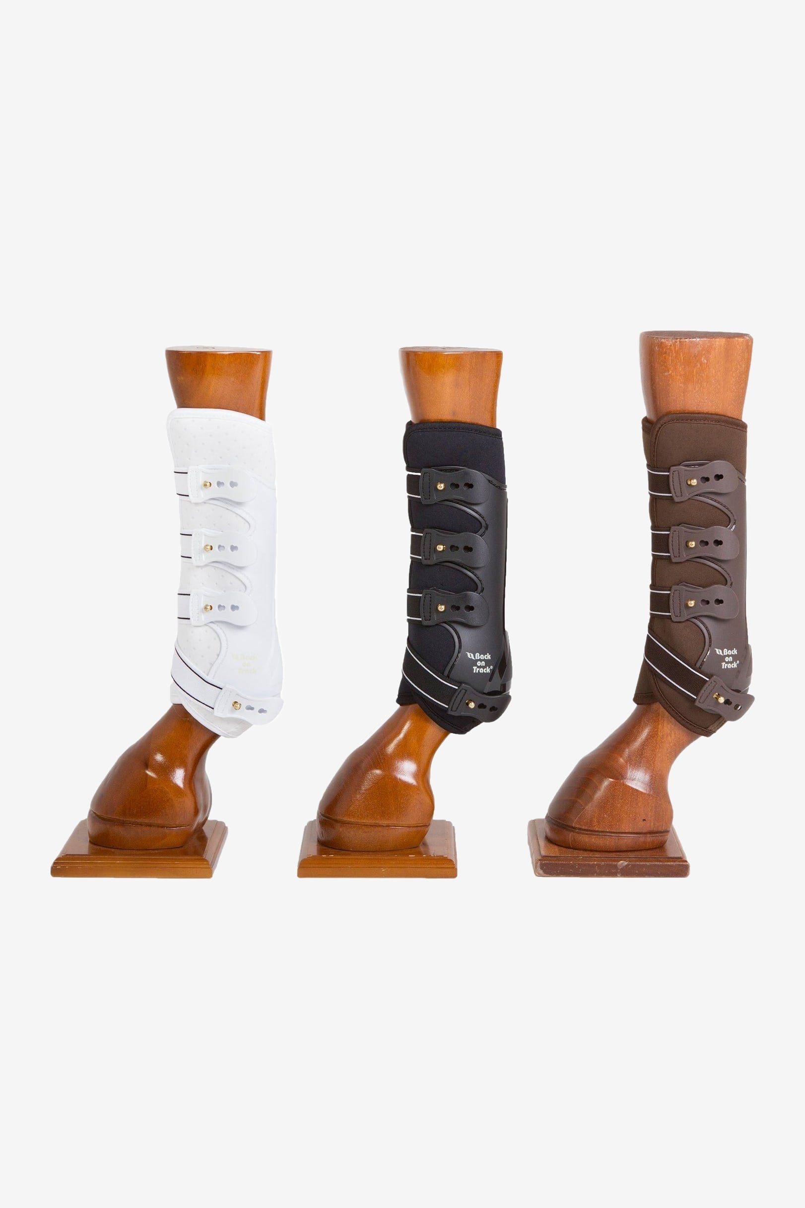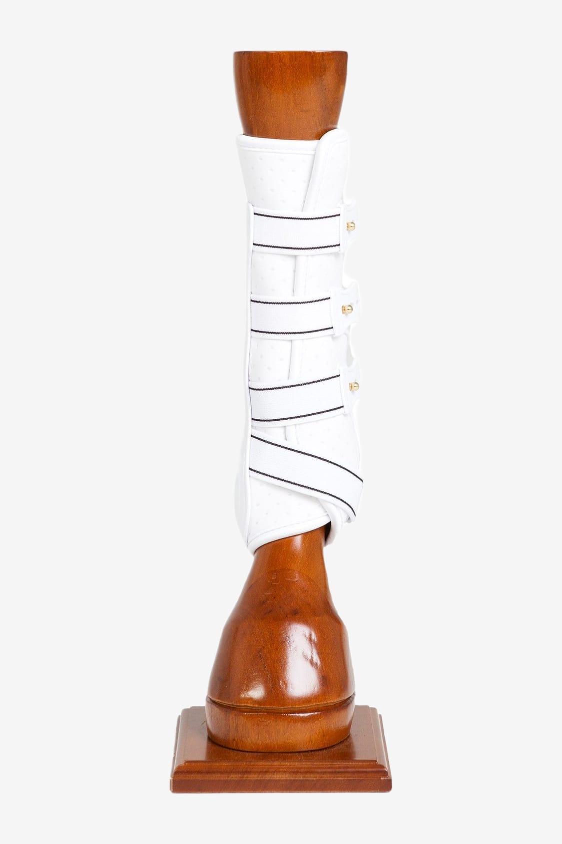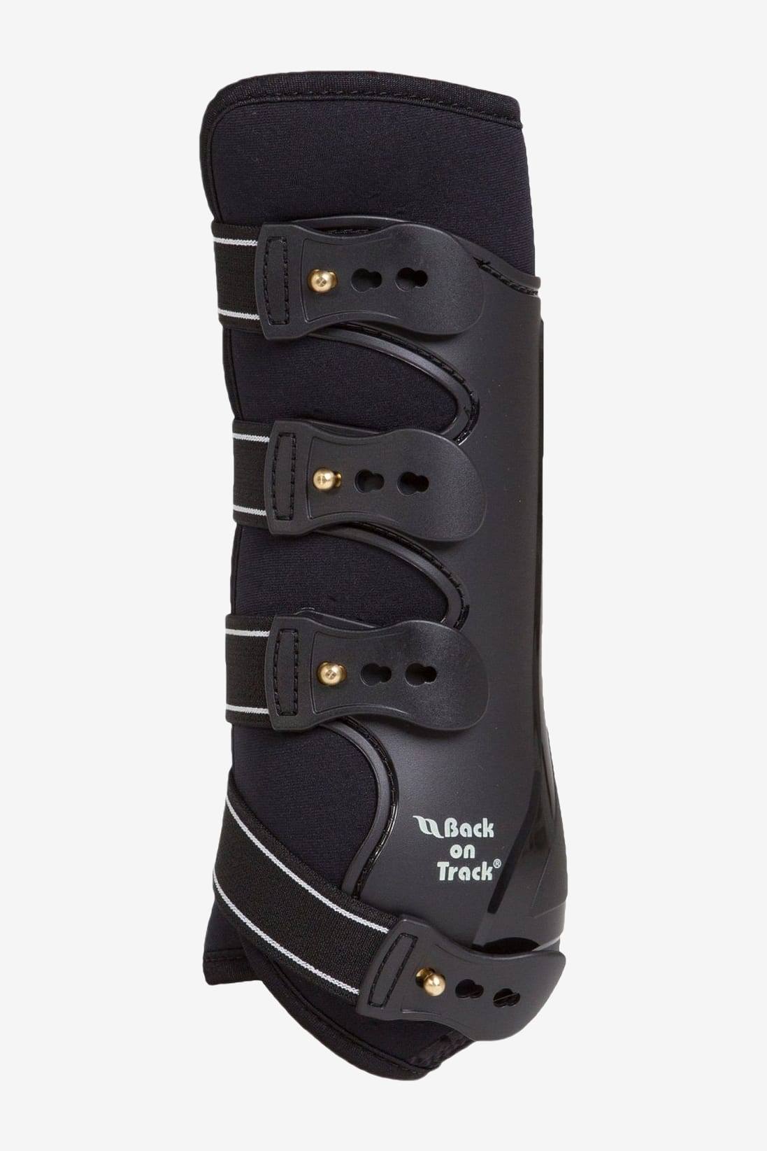 De gamacher hebben een duurzame buitenschaal en een vulling van zacht schuim die helpt om de impact van harde stoten en schrammen te verminderen. De binnenkant is geperforeerd voor extra luchtcirculatie. De gamacher worden vastgemaakt met sterke elastische sluitingen en messing knopen, evenals een extra versteviging aan de onderkant. Klassiek zwart met witte details op de sluitingen.