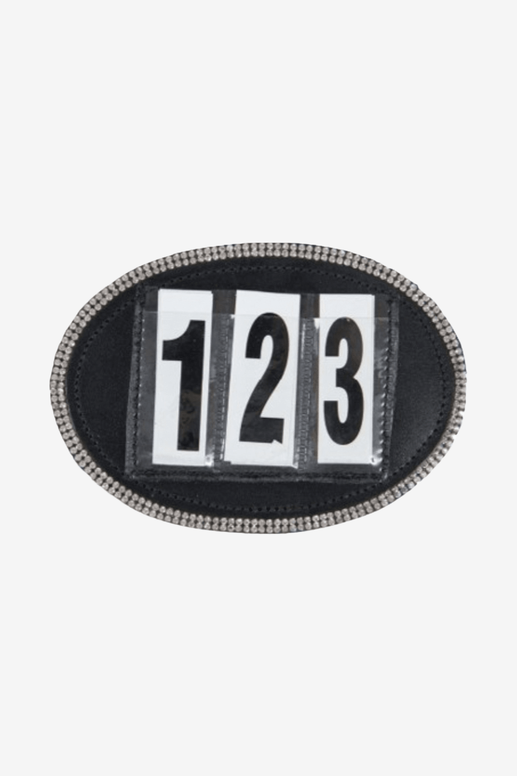 Een ovaal wedstrijdnummerbordje met stenen langs de rand.