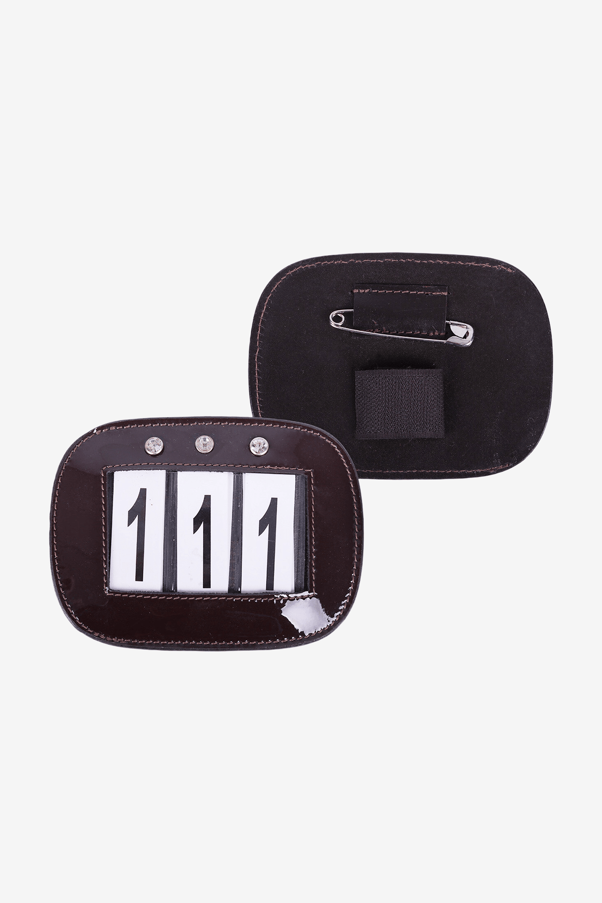 Discreet nummerlabel van leer dat goed blijft zitten. Drie mooie strass-steentjes aan de bovenkant. Kan bevestigd worden aan een hoofdstel, zadel of zadeldek.