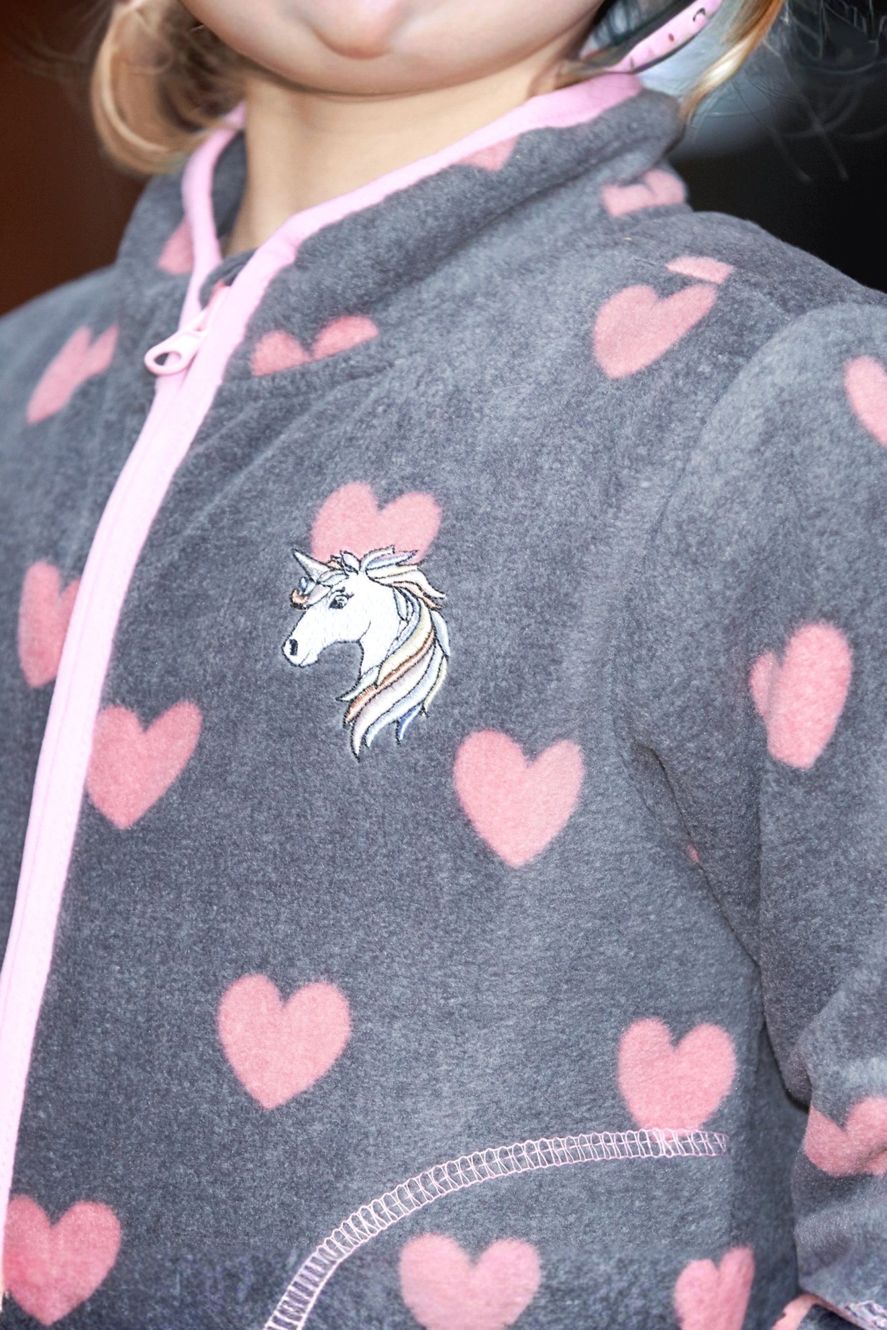 Gulligaste mönstret med fina rosa hjärtan på den gråa tröjan.