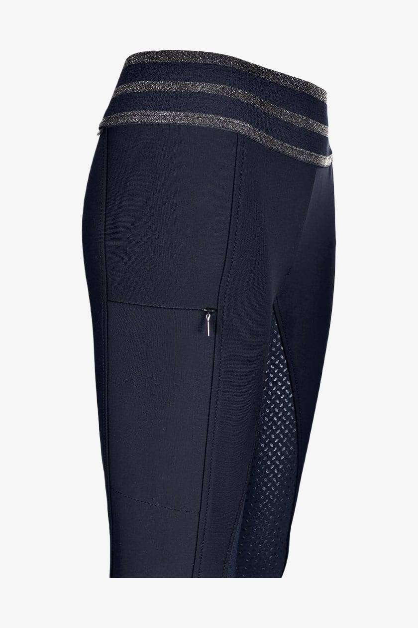 Rijbroek met full seat in donkergrijs van Pikeur. Rijbroek met hoge taille en elastische tailleband in een zachte en functionele stof. De broek heeft siliconen grip en is een slank model met extra beenlengte. De broek is voorzien van een zakje voor een mobiele telefoon dat sluit met een rits, evenals Pikeur Strass op het rechterdijbeen.