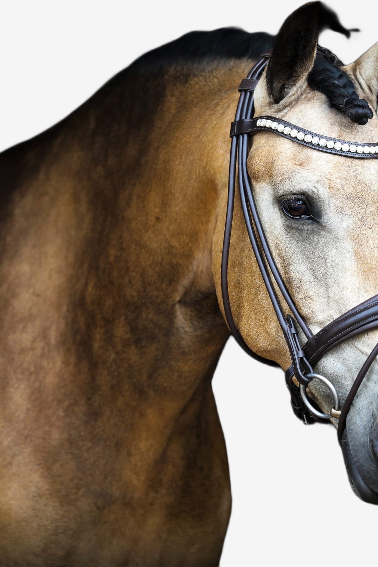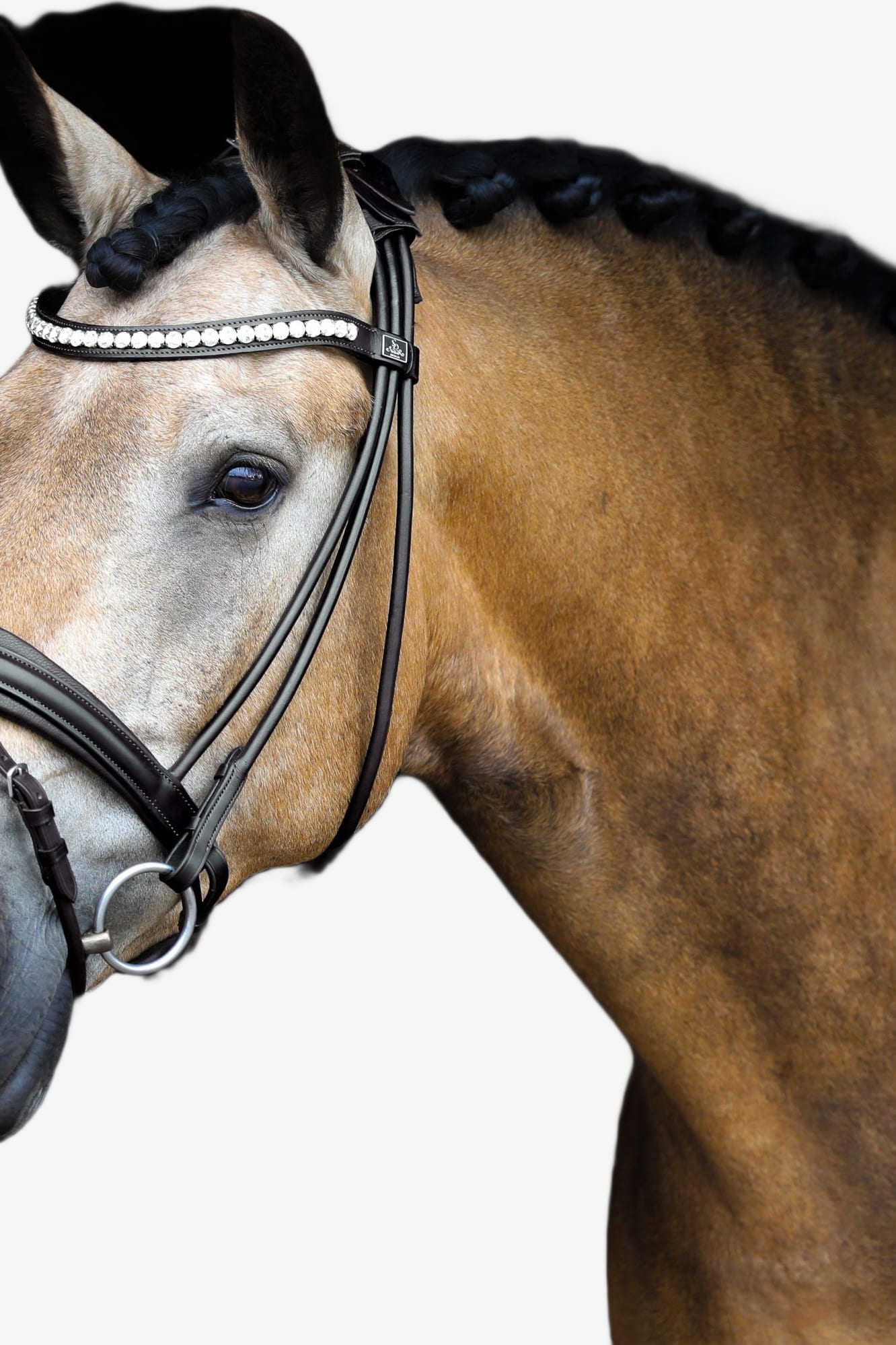 Stijlvolle en elegante neusriem die ongelooflijk zacht en soepel is. De neusriem is in het midden 5 cm breed en loopt aan de uiteinden taps toe tot slechts 3 cm, zodat er geen druk op de zenuwen komt en er voldoende ruimte is voor het bit.