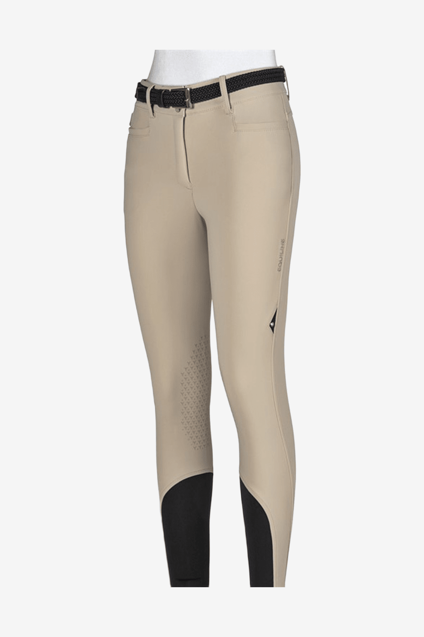 Rijbroek van Equiline. Strakke damesrijbroek gemaakt van B-move 4-seizoenenmateriaal (340g/m2) met extra hoog comfort. Kniegripsysteem dat perfecte stabiliteit in het zadel garandeert. Een zeer comfortabele en elastische rijbroek met hoge ademendheid en sneldrogend effect. Equiline-logo op het been in contrasterende kleur. Twee voorzakken en iets hogere boorden aan de onderkant. Net boven de knie op het linkerbeen zit een zeer fijn detail van een zilveren knoop.