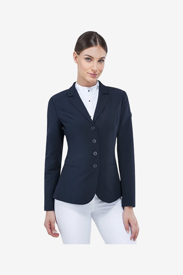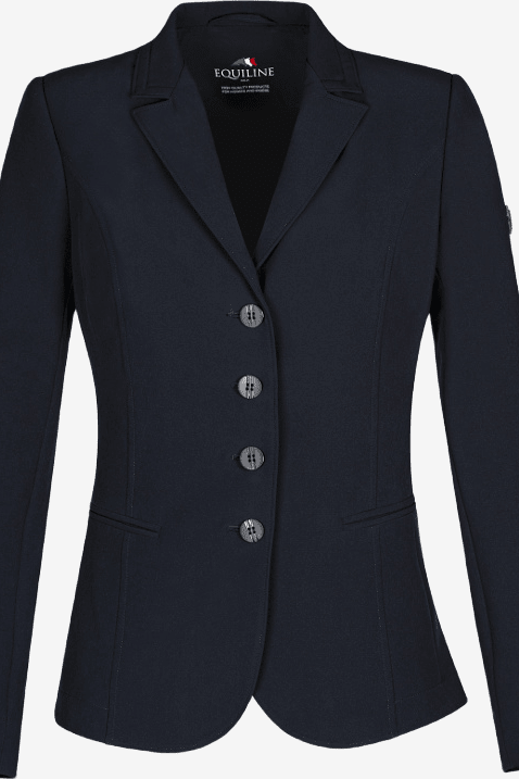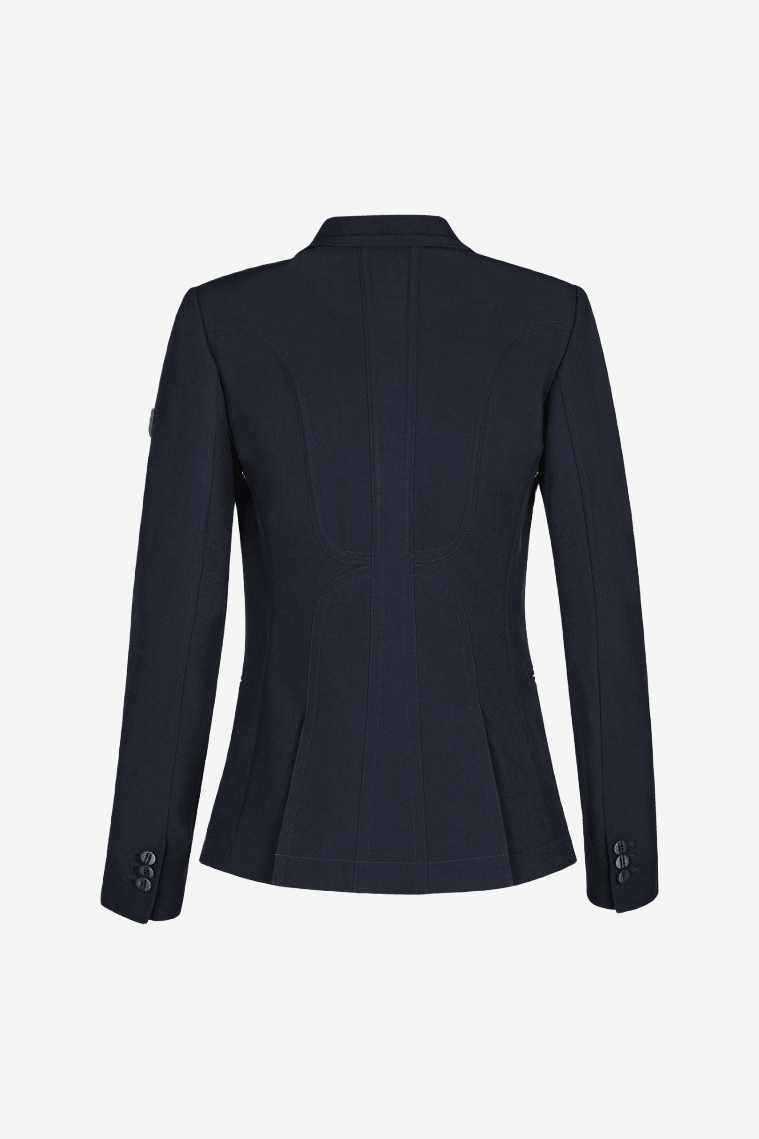 Elegante en stijlvolle wedstrijdjas in damesmodel. Mooi getailleerd met twee splitten aan de achterkant. Zacht en rekbaar materiaal dat je bewegingsvrijheid geeft ondanks het vrouwelijke design. Twee sierzakken aan de voorkant en vier subtiele knopen. Twee kleine ventilatiegaatjes met stijlvolle zilverkleurige details onder de armen aan beide zijden.