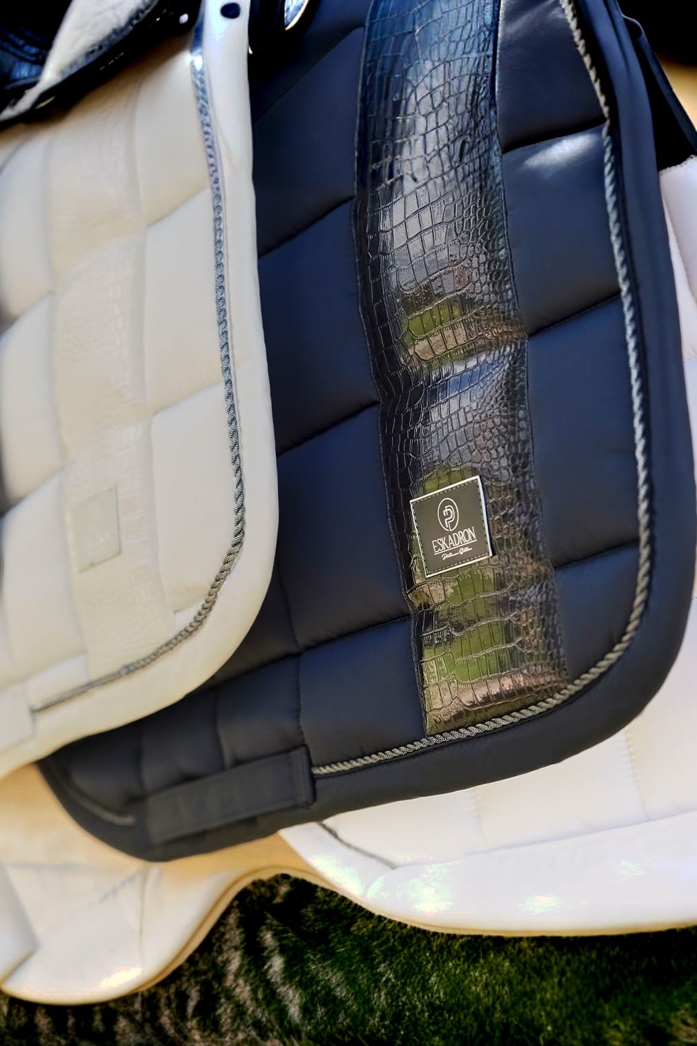 Verticaal bandje in croco dat past bij de tint van het zadeldek.