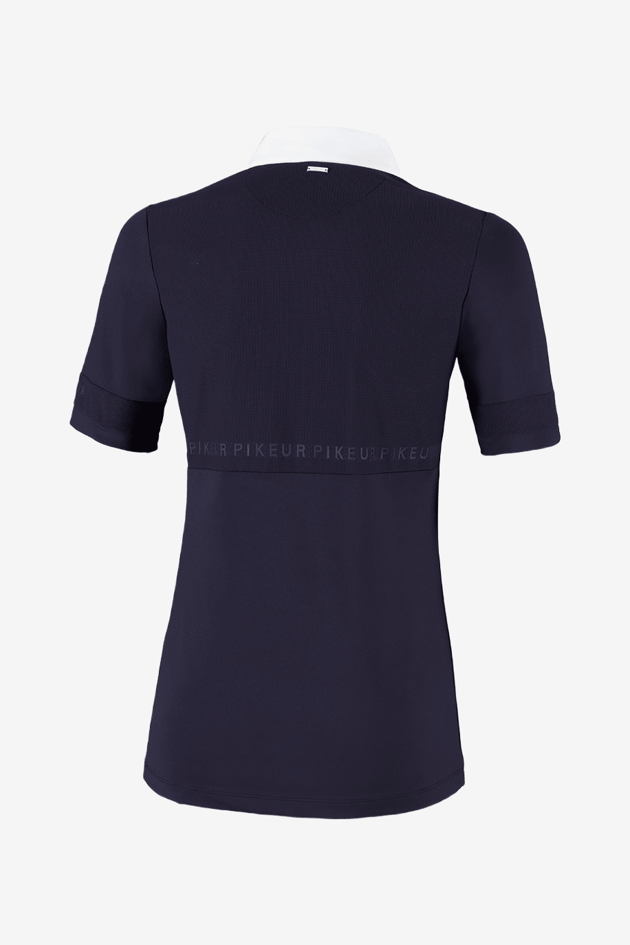 Een stijlvol wedstrijdshirt gemaakt van functioneel materiaal dat koel en licht aanvoelt op het lichaam. Het voert vocht weg van het lichaam en houdt je comfortabel. Meshstof op het bovenste deel van de rug als een stijlvol en vrouwelijk detail, ook meshdetails op de mouwen. Pikeur-print in het midden van de rug en op de linkermouw. Korte zilverkleurige rits aan de voorkant.