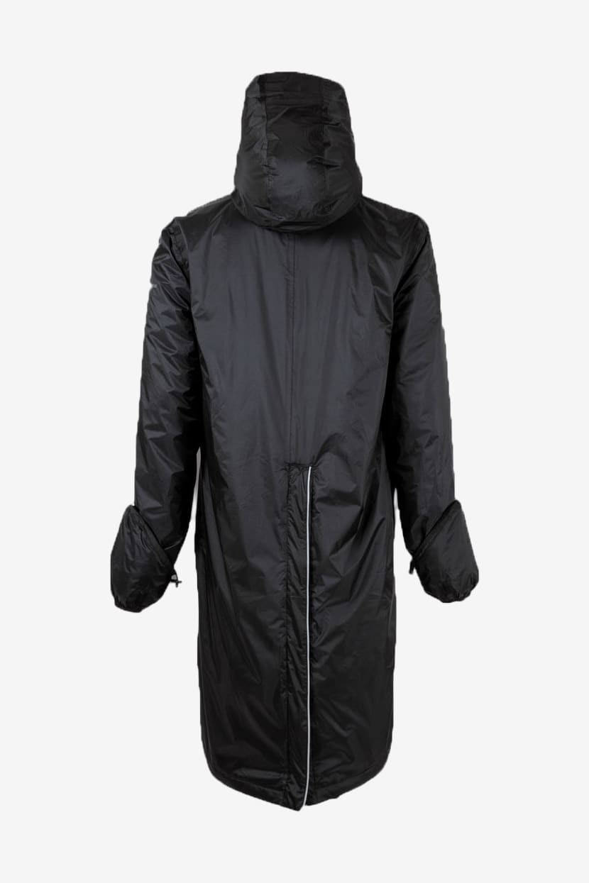 Kołnierz jest wysoki i chroniący, a mankiety można odwinąć, aby zabezpieczyć dłonie przed deszczem i wiatrem. Dwukierunkowy zamek z przodu oraz rozcięcie z tyłu, w połączeniu z elastycznymi paskami na nogi po wewnętrznej stronie płaszcza, zapewniają wygodną ochronę przed deszczem i niepogodą nawet w siodle.