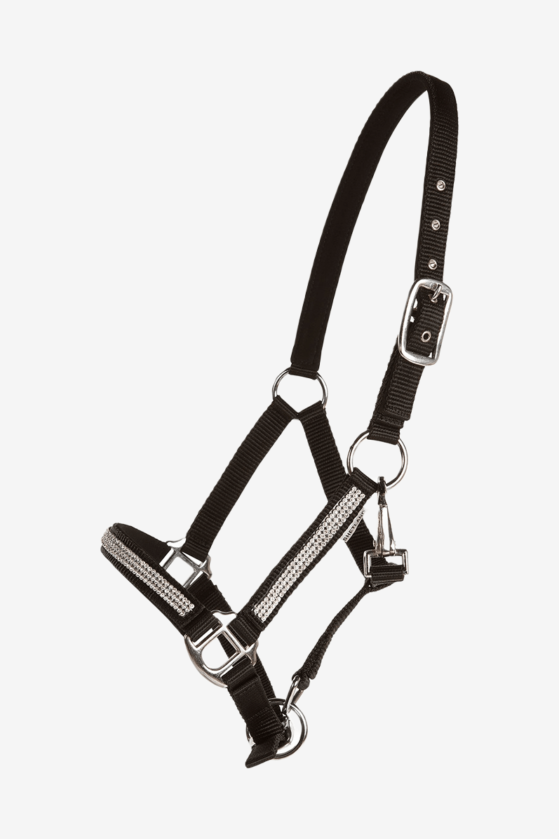 Mjukt fodrad grimma med ställbar funktion både i nacke och runt nosen. Pryds av stenar/kristaller på sidor och över nosen.