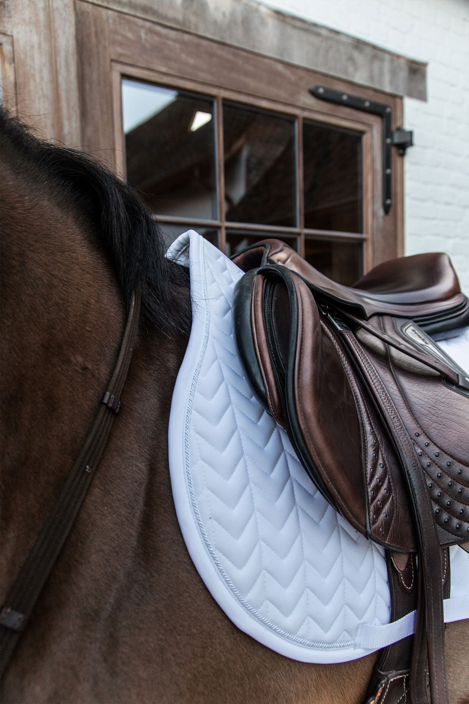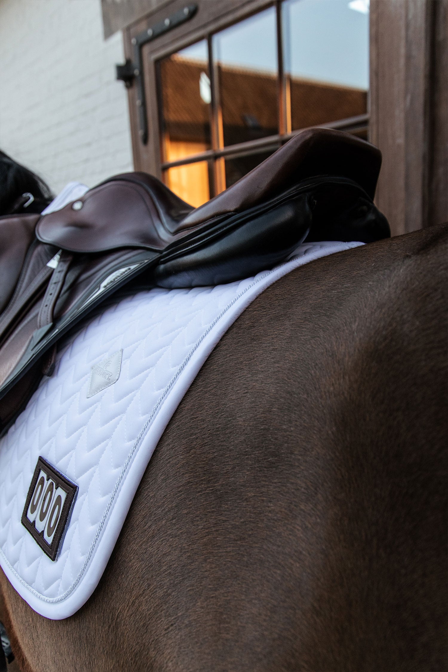 Hoppschabrak Fishbone från Kentucky horsewear är formad för hoppning och ger utmärkt dämpning mellan hästens rygg och sadeln samtidigt som den skyddar mot friktion.