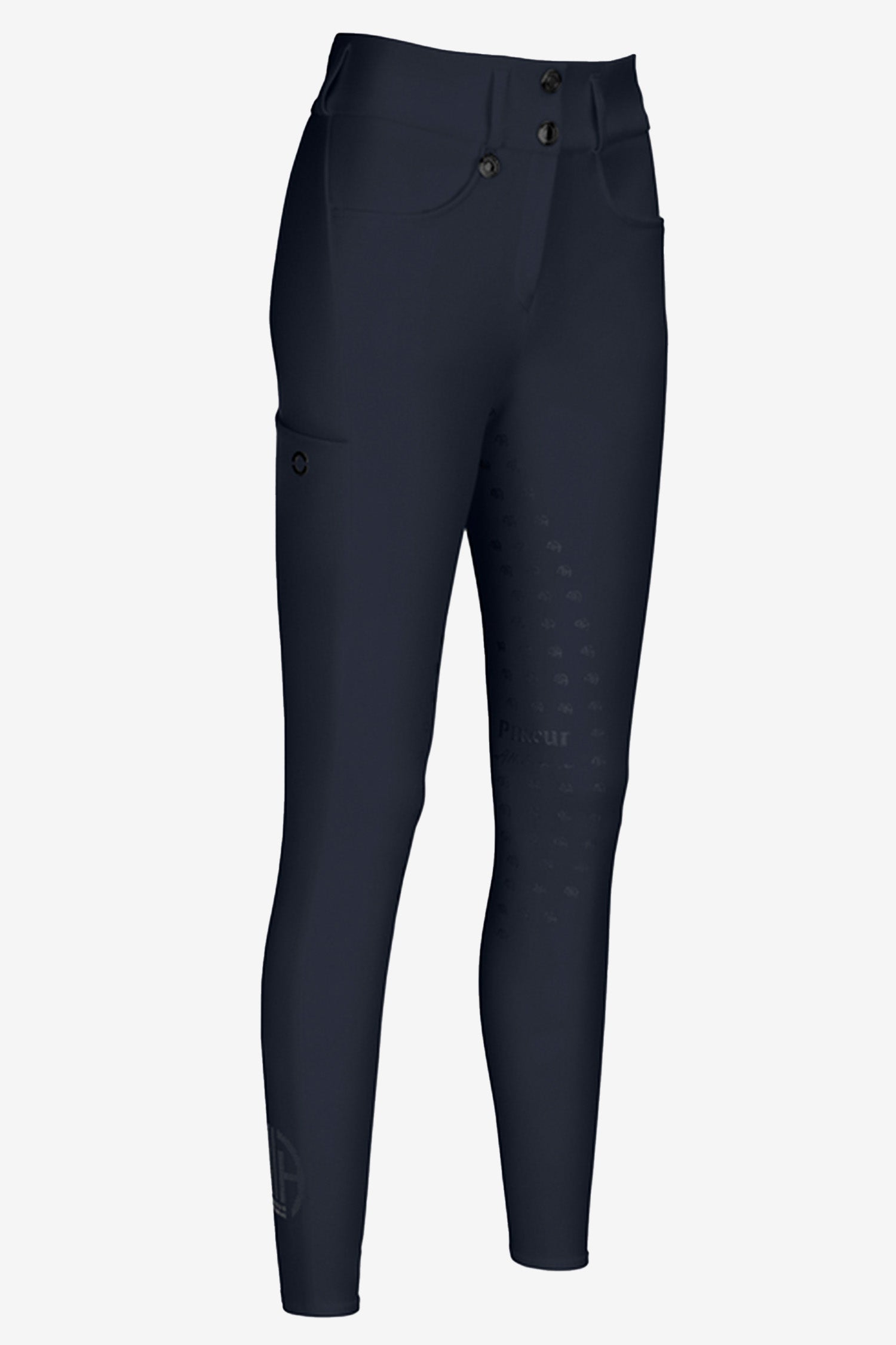 Spodnie posiadają stylowe panele screen print w stylu Pikeur Athleisure oraz szeroki pas z tkaniny zewnętrznej, zapewniający pewne i stabilne dopasowanie. Pas zapinany jest na dwa guziki dla większego komfortu i wsparcia.