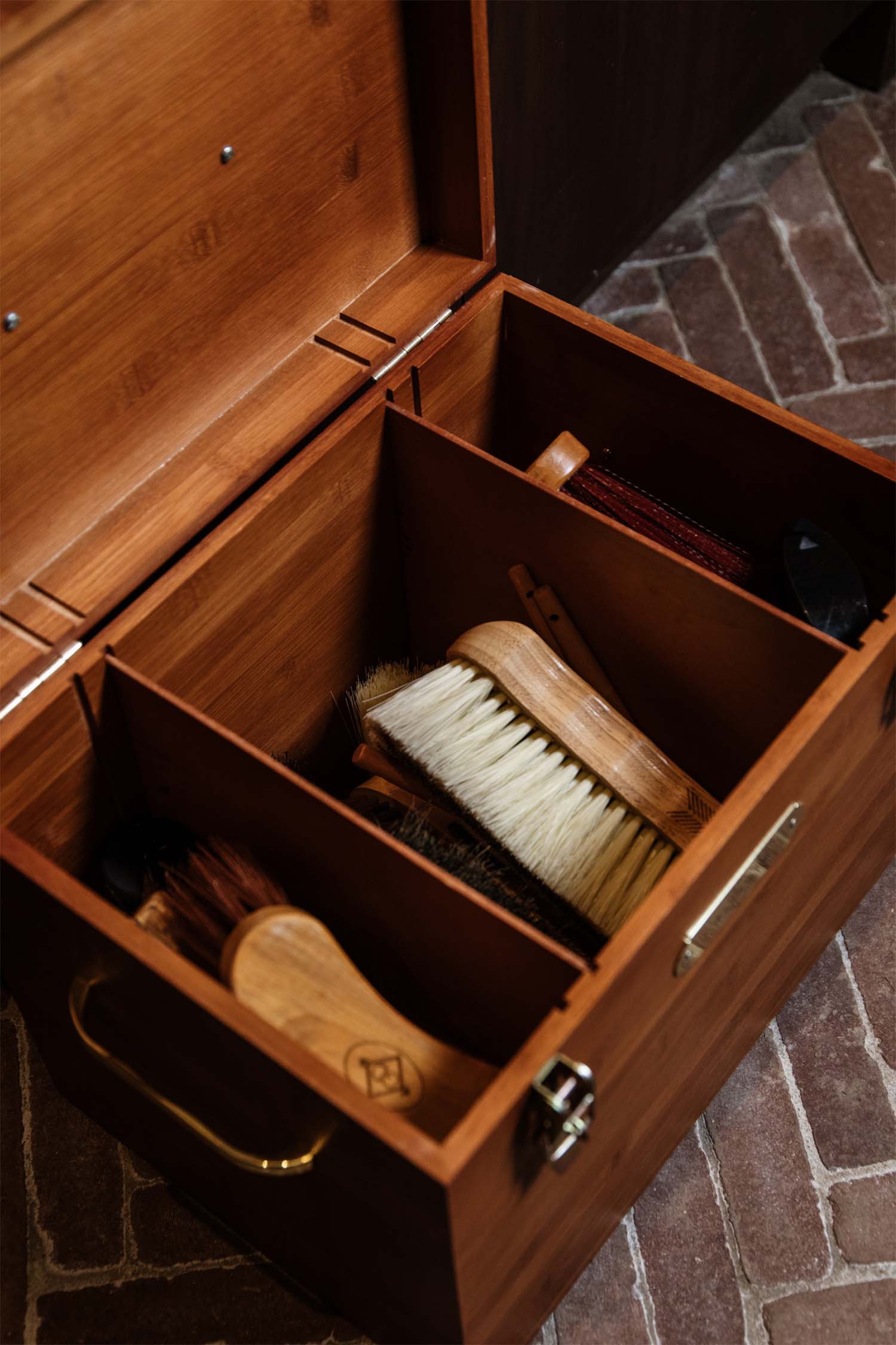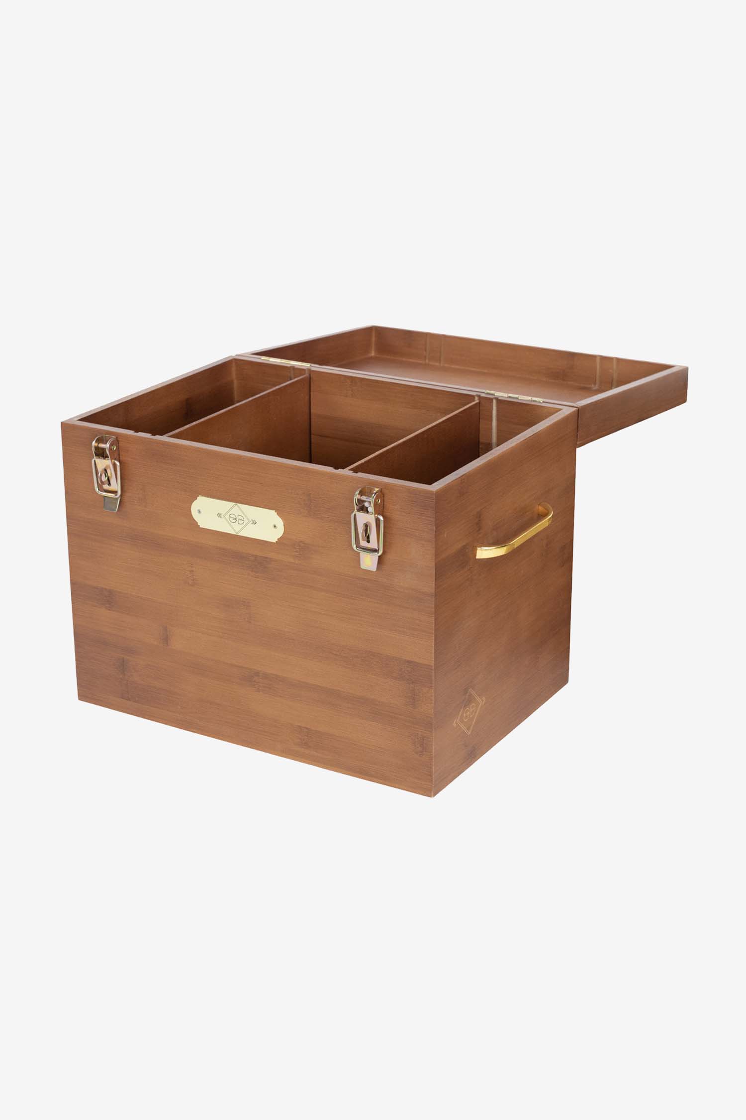 Górna część otwiera się i może być zamknięta za pomocą dwóch złotych okuć, które można również zabezpieczyć kłódką. Wewnątrz znajduje się duża komora (25x38x26 cm), którą można podzielić na dwie lub trzy części dzięki 2 cienkim, wyjmowanym przegrodom. Możesz zorganizować wnętrze swojej skrzynki w unikalny sposób!