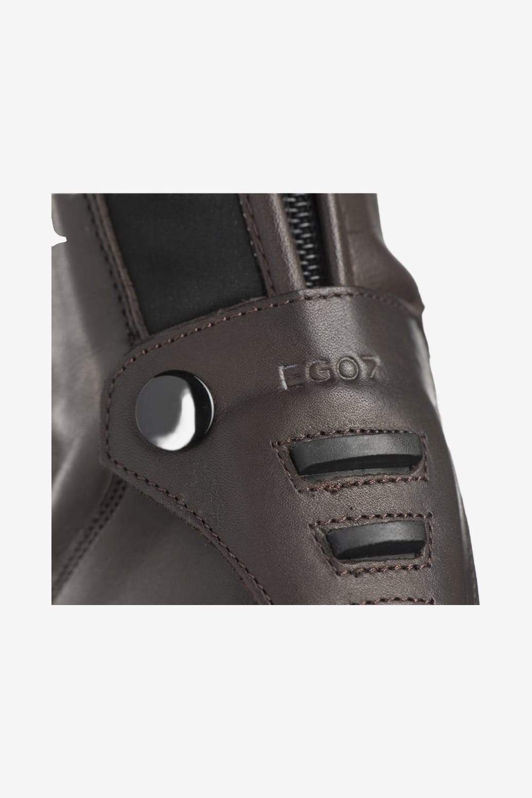 Buty wykonane są z wysokiej jakości skóry licowej oraz wyjątkowo miękkiej skóry na podbiciu dla zwiększenia komfortu. Pełny zamek błyskawiczny z bardzo wytrzymałego materiału z tyłu z elastyczną wstawką zapewnia stabilność, wysoki komfort, swobodę ruchów i dopasowanie niczym w butach szytych na miarę. Po wewnętrznej stronie łydki skórę licową zastąpiono innowacyjnym i bardzo wytrzymałym materiałem E-tex. Chroni on lepiej łydkę i zapewnia doskonałą przyczepność oraz kontakt z koniem i siodłem. Z tyłu znajduje się plastikowy wspornik na ostrogę z trzema różnymi pozycjami, który utrzymuje ostrogę stabilnie na miejscu.