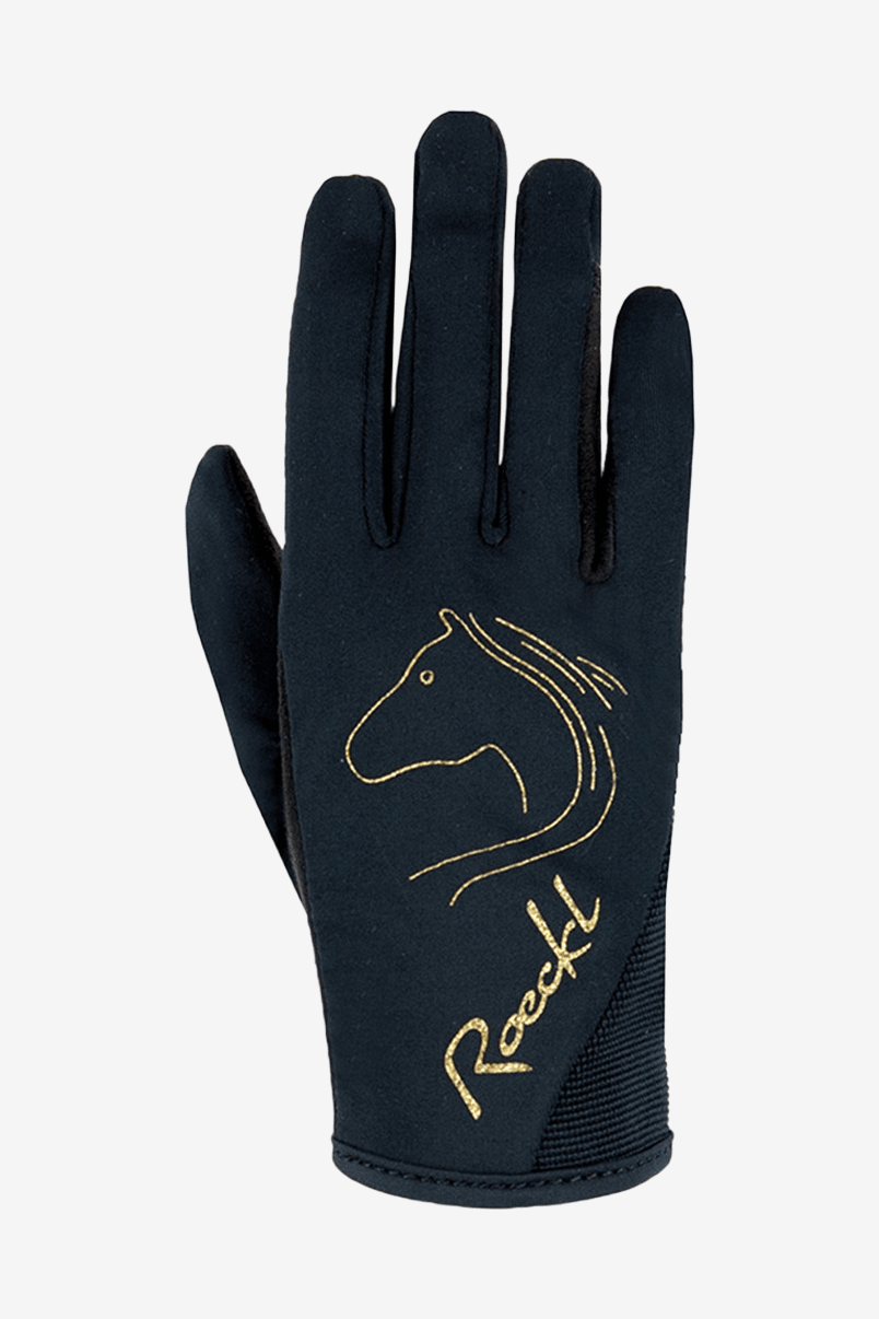 Motyw konia i logo w brokatowym nadruku sprawiają, że rękawiczka jest bardzo stylowa i urocza.