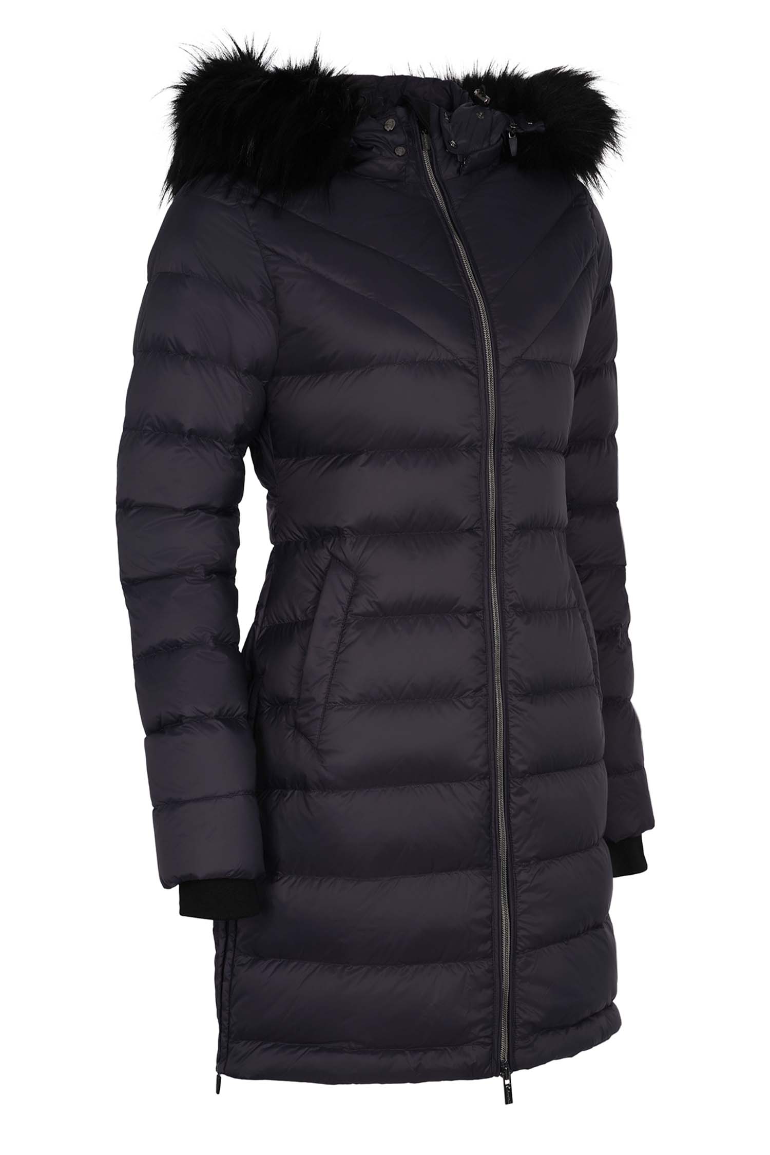 Kurtka puchowa Samshield Everest to długi, kobiecy płaszcz z odpinanym kapturem i odpinanym futerkiem na kapturze.