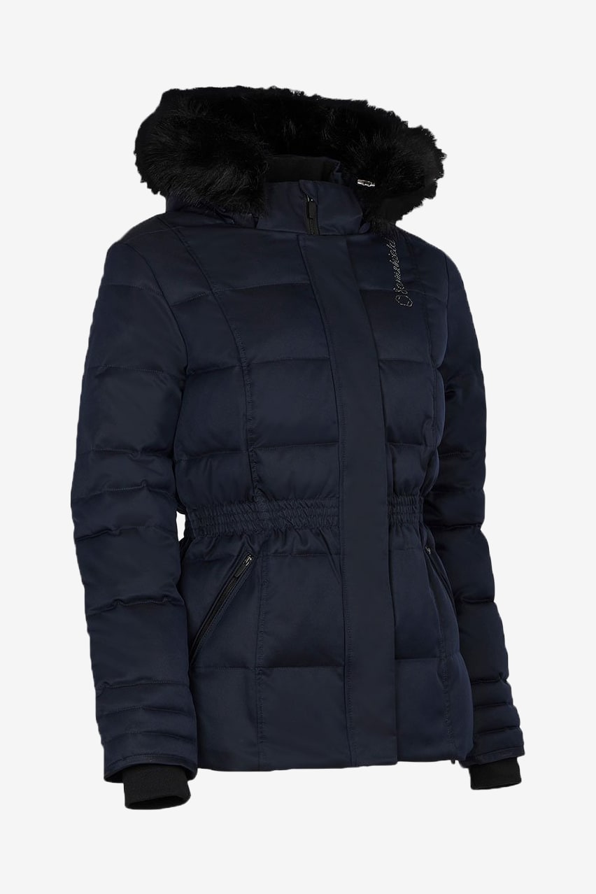 Den mysiga huvan är avtagbar och detaljerad med en avtagbar fuskpälskrage.