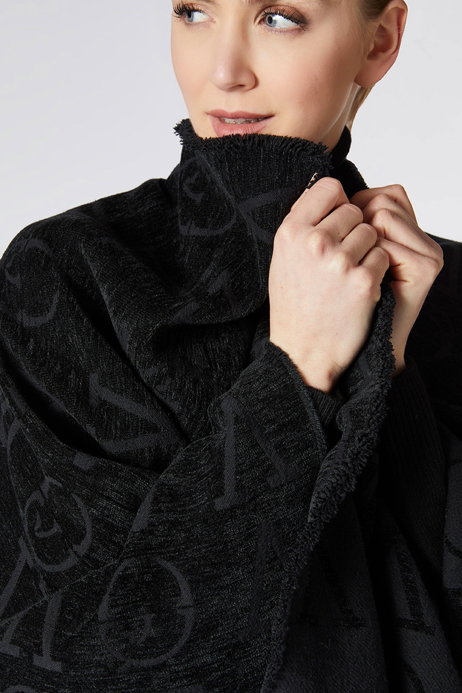 Jest drobno dziergany z logo Vestrum ton w ton i ma małe frędzle na dole.