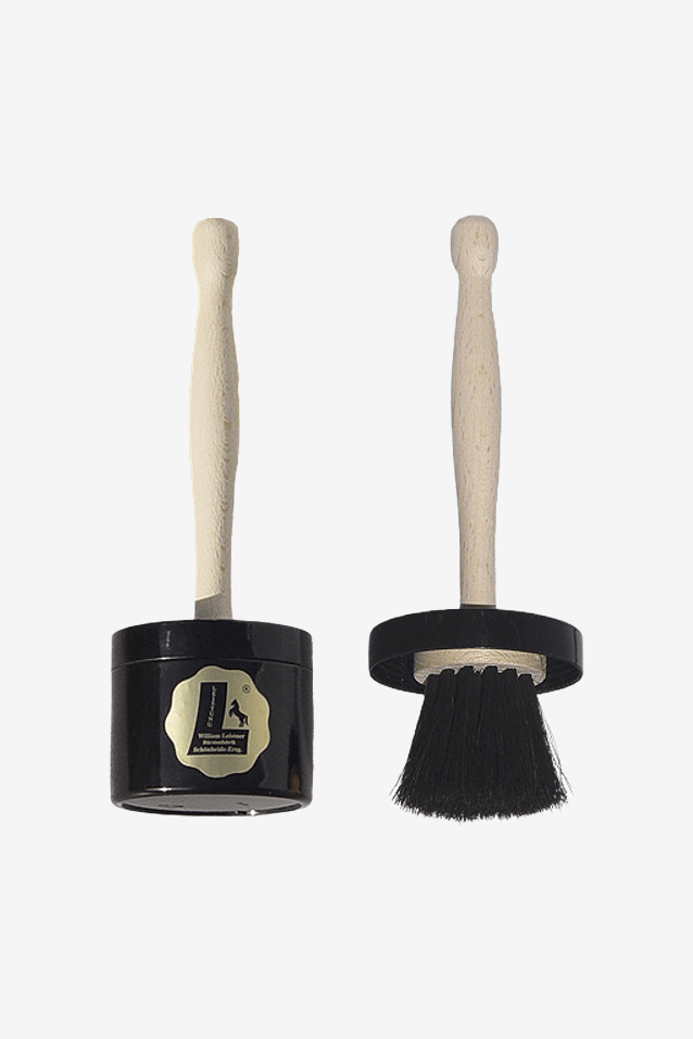 Szczotka do kopyt z drewnianą rączką, którą łatwo wkręcić do dołączonego plastikowego pojemnika. Zminimalizuj bałagan i rozlania, zawsze przechowując szczotkę szczelnie zamkniętą. 100% końskie włosie.