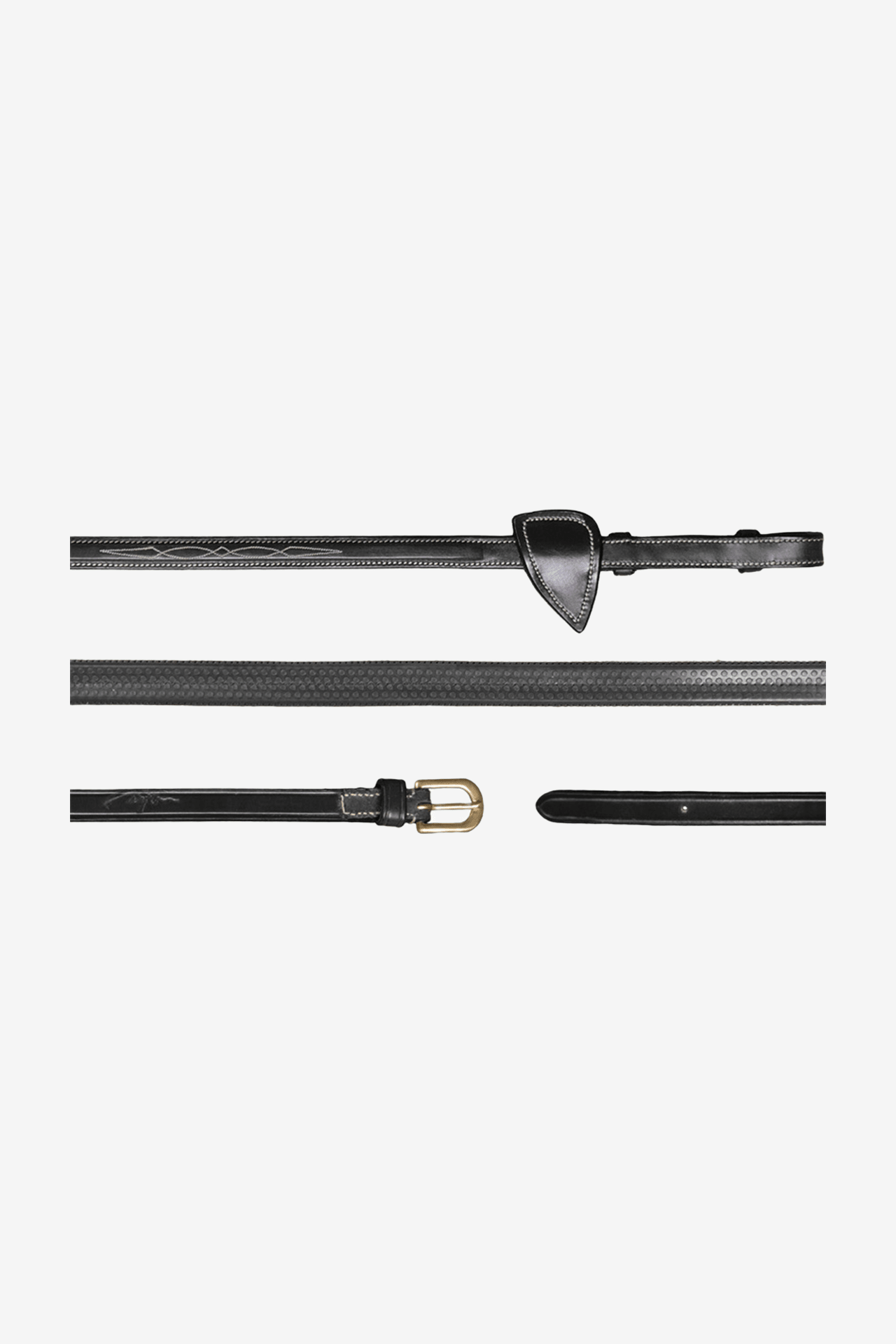 Gummitygel i fint spanskt läder med inåtvänt spänne. Vit mönstersöm för extra stil, mässingspänne för hållbarhet och eleganta martingalstoppar för en snygg look.