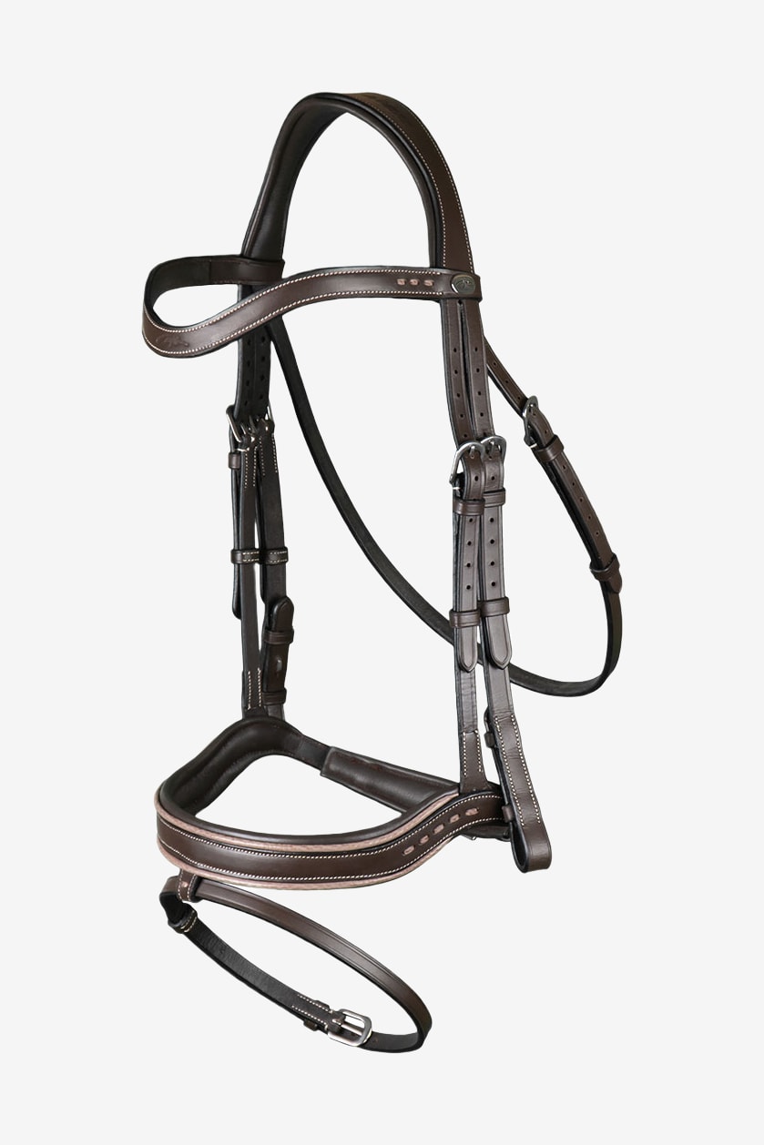 Trensen har et buet pandebånd med Dyón-logo og dekorative syninger, der giver en flot detalje.
