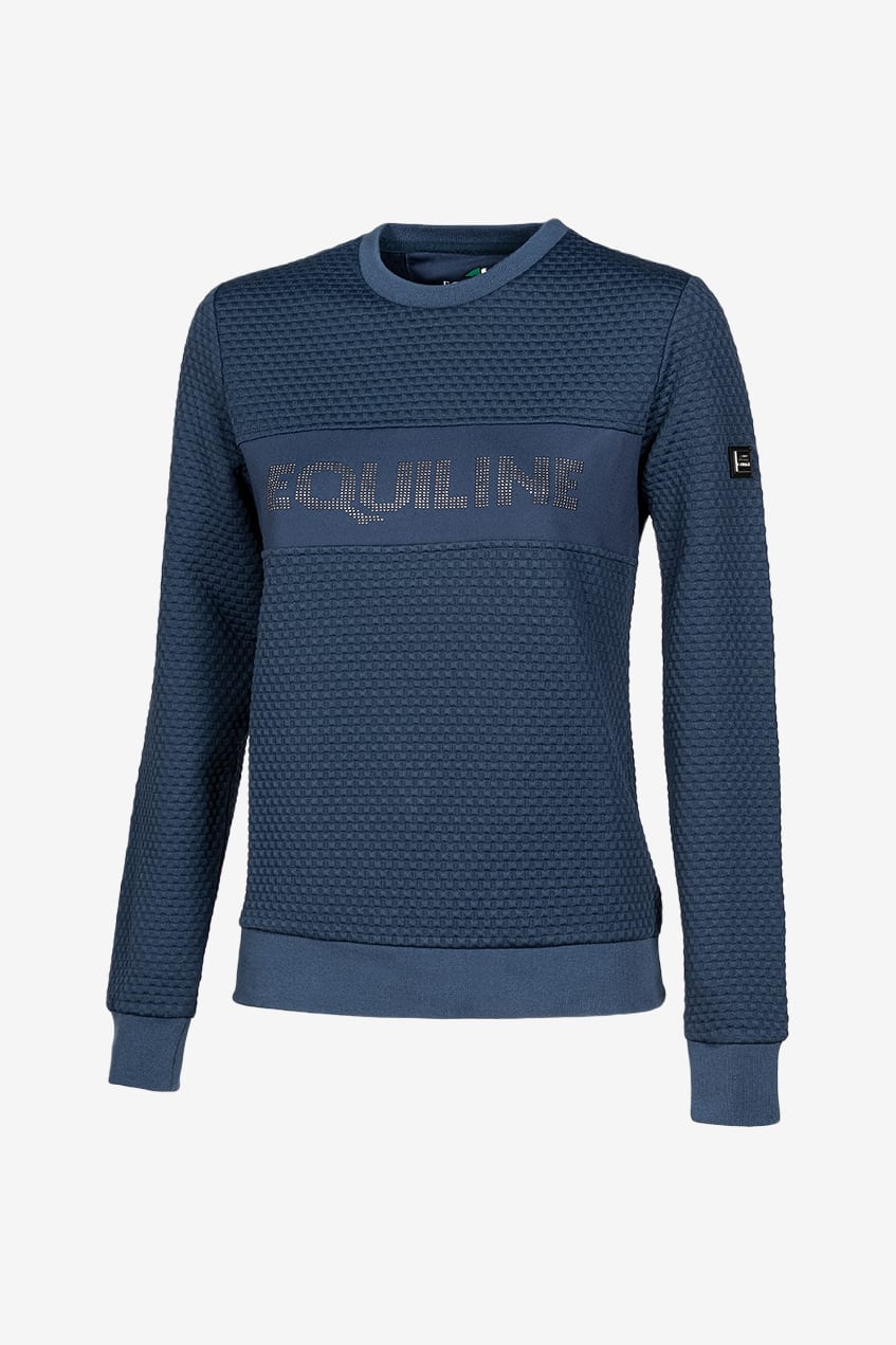 Dame trøje med rund halsudskæring og 3D-åndbart og strækbart materiale kombineret med ribbede detaljer. På brystet er trøjen detaljeret med tone-i-tone mikronubbe, der skaber Equiline-logoet.