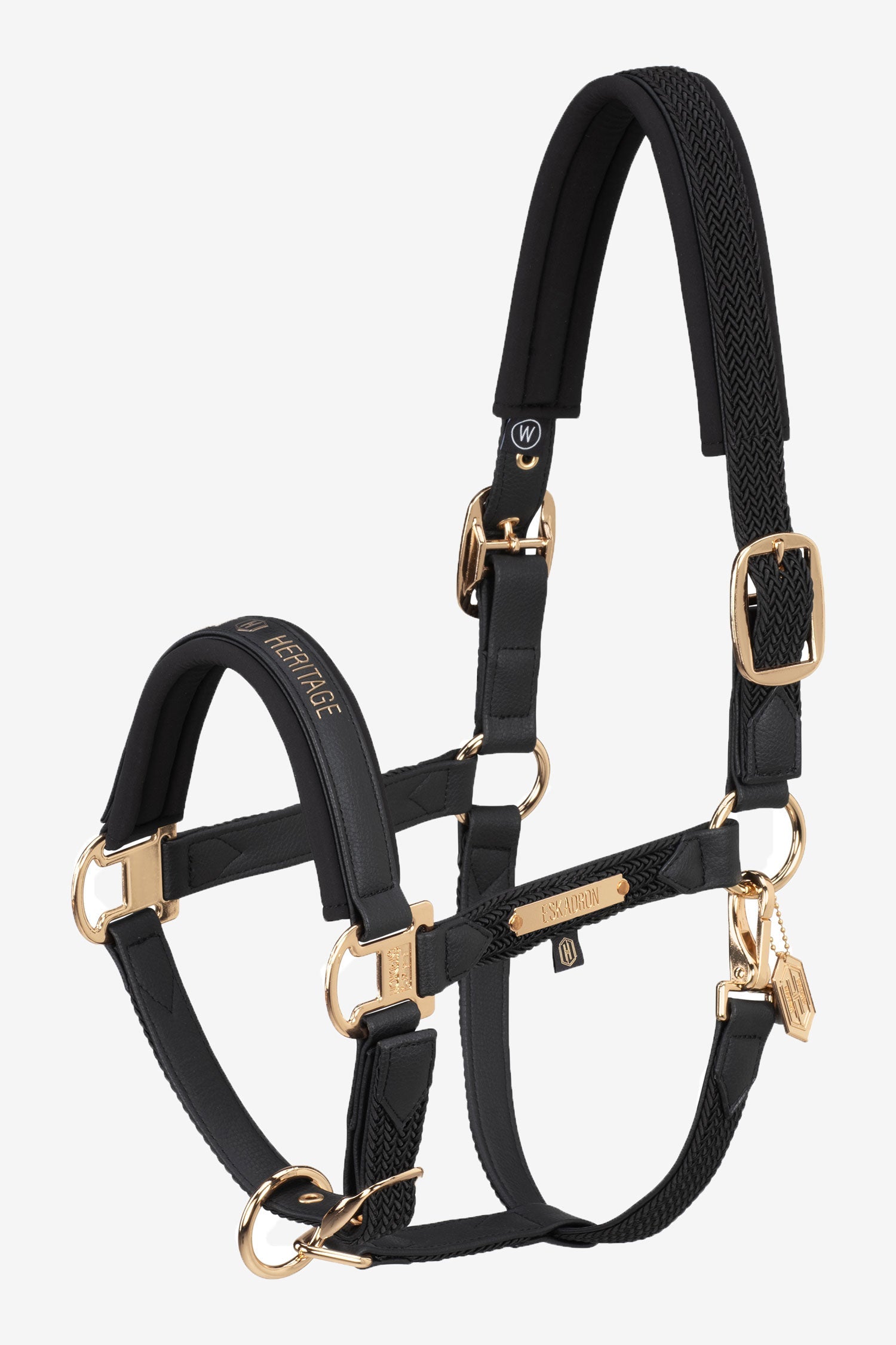Stilfuld og elegant med flot design takket være fletning over nakke og sidestykker. Guldfarvede spænder med gode justeringsmuligheder både omkring næsen og på begge sider af nakkeremmen.