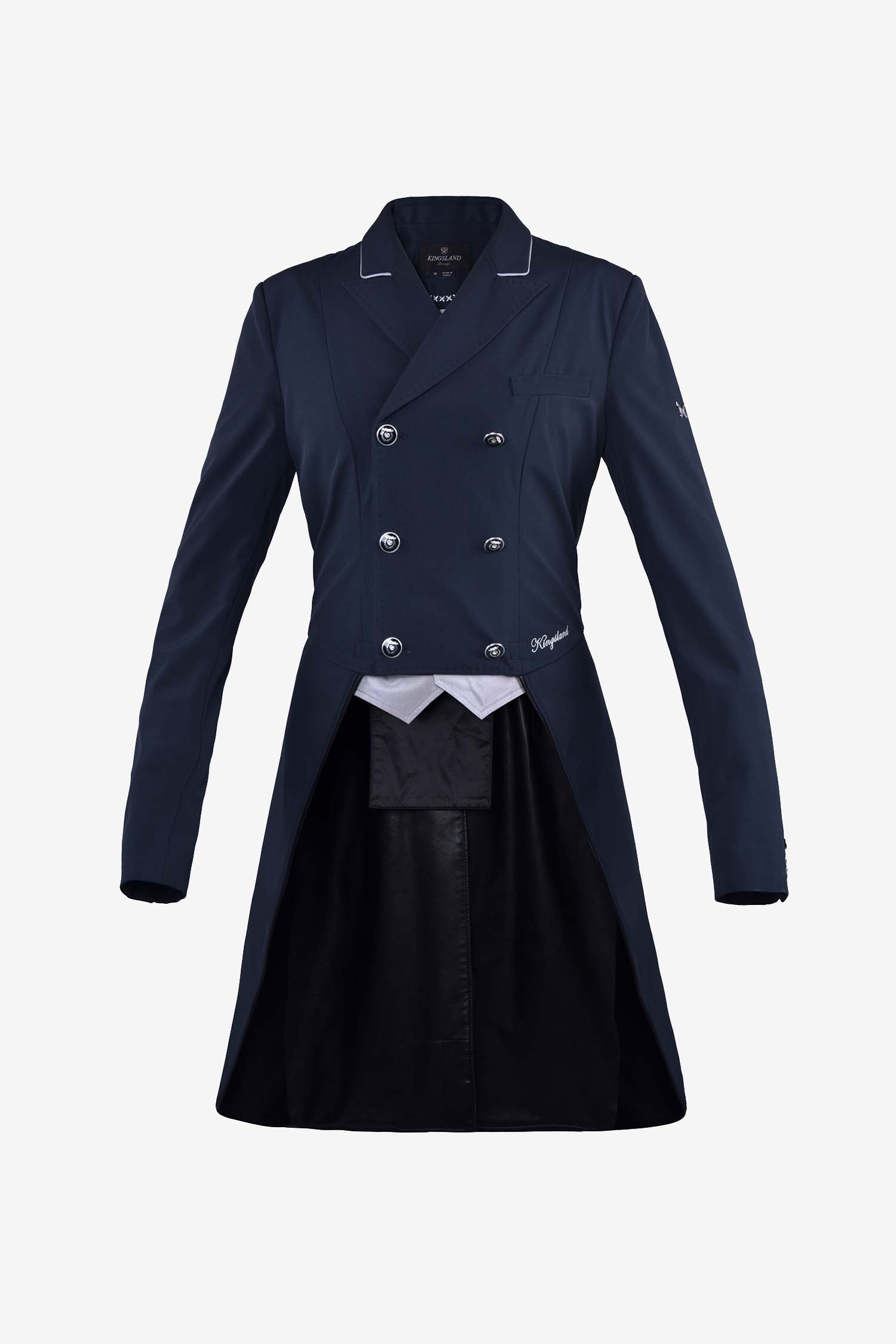 Elastisk og smidig med en feminin pasform. Broderet logo på højre lomme. Sølvfarvet paspolering langs kraven. Aftagelige sølvfarvede flapper foran. Dobbeltknappet med knapper med logo.